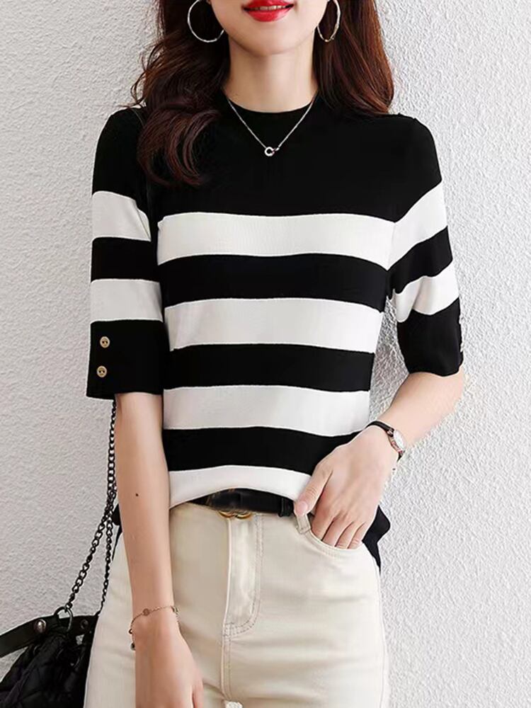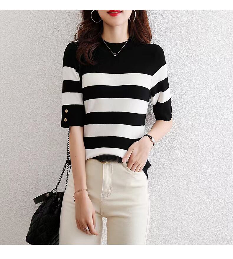 送料無料 Tシャツ夏半袖 Tシャツ女性レディースニットトップスストライプ O ネック Tシャツ Camisetas ショート ハーフスリーブ サマー 夏物 Oネック AE1212887752479140351