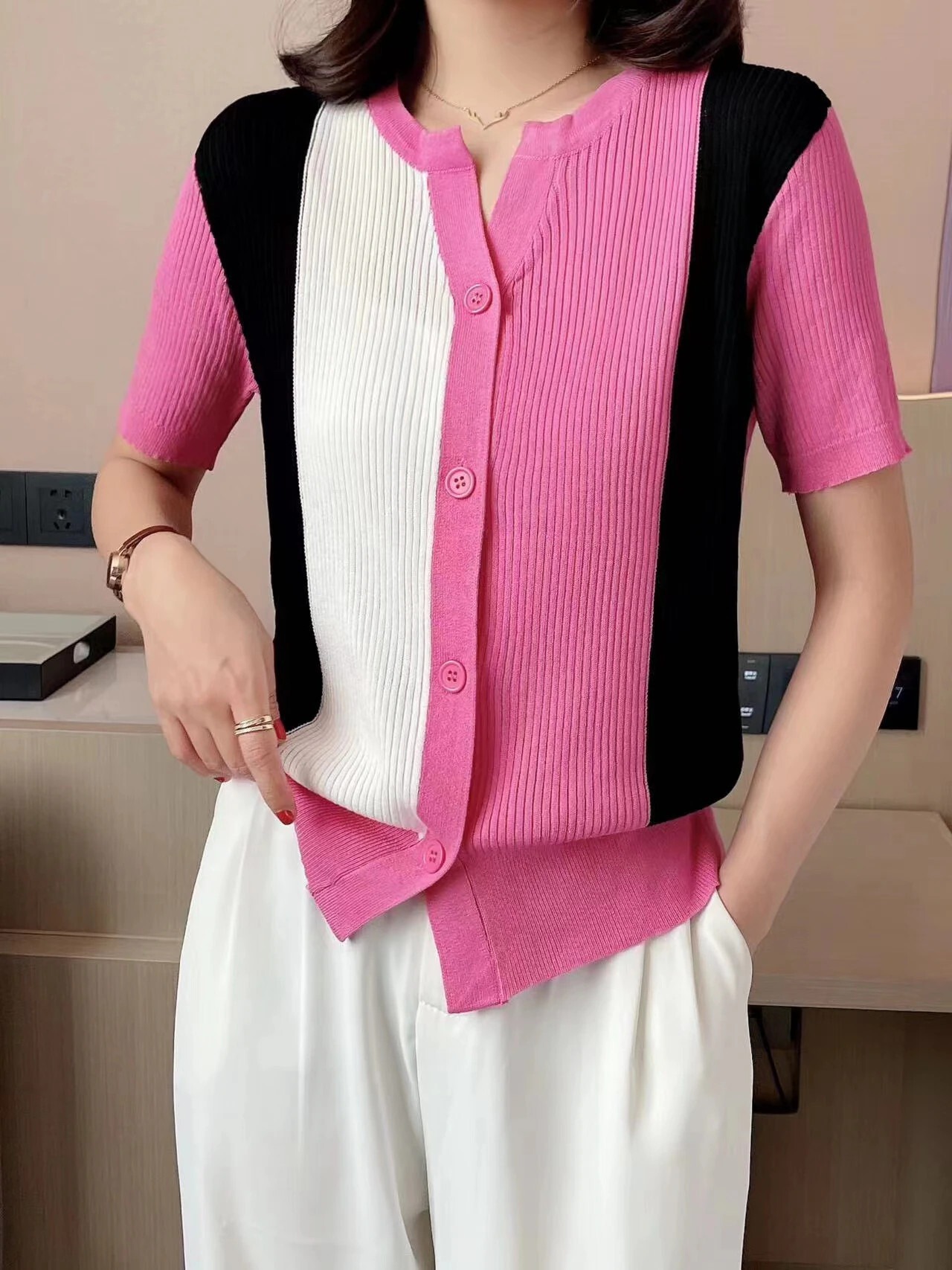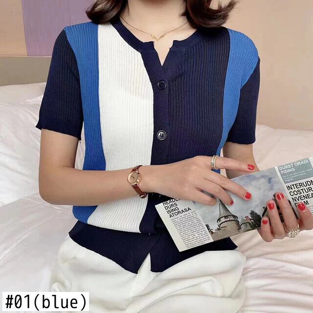 送料無料 Tシャツ 2023 夏カーディガン Tシャツ女性コントラストカラー半袖 V ネックニットトップススタイルの服 ショート ハーフスリーブ サマー 夏物 Vネック AE1212887718099328880