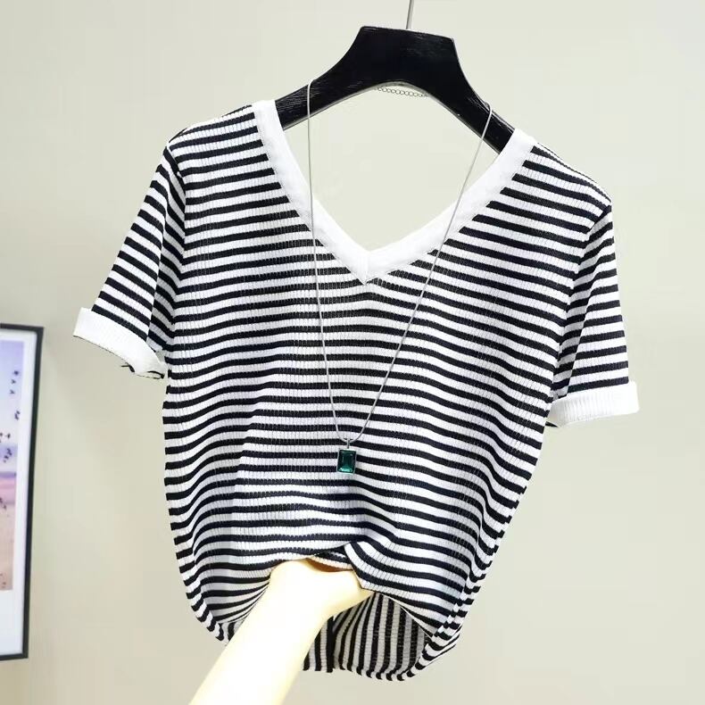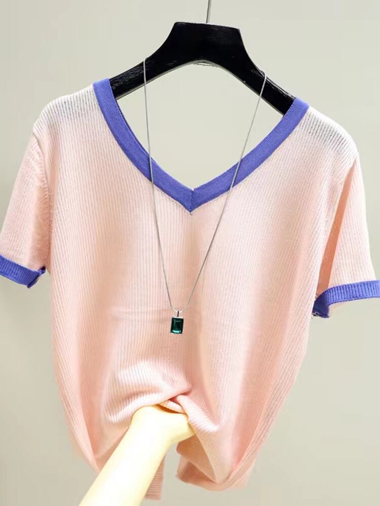 送料無料 ニットトップ女性 Tシャツコントラストカラー半袖 Tシャツ V ネック婦人服 Tシャツ 2022 夏 ショート ハーフスリーブ サマー 夏物 Vネック AE1212887796720239542