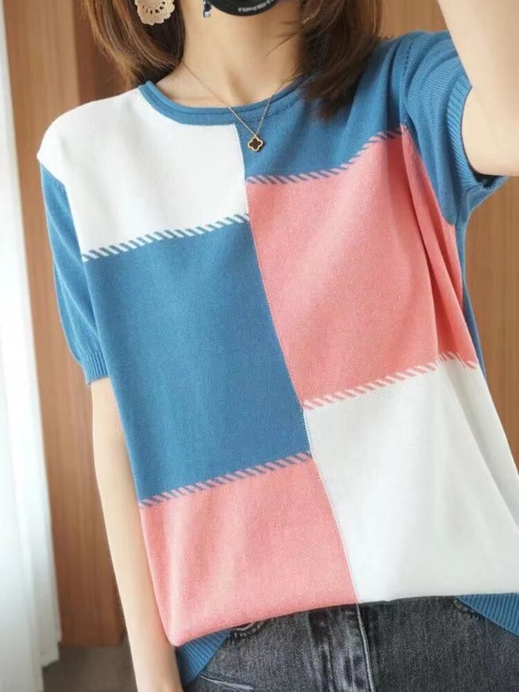 送料無料 薄いパッチワーク Tシャツ O ネックニットトップス Tシャツ女性半袖 Tシャツ 2023 夏レディース ショート ハーフスリーブ サマー 夏物 Oネック AE121288777001961516