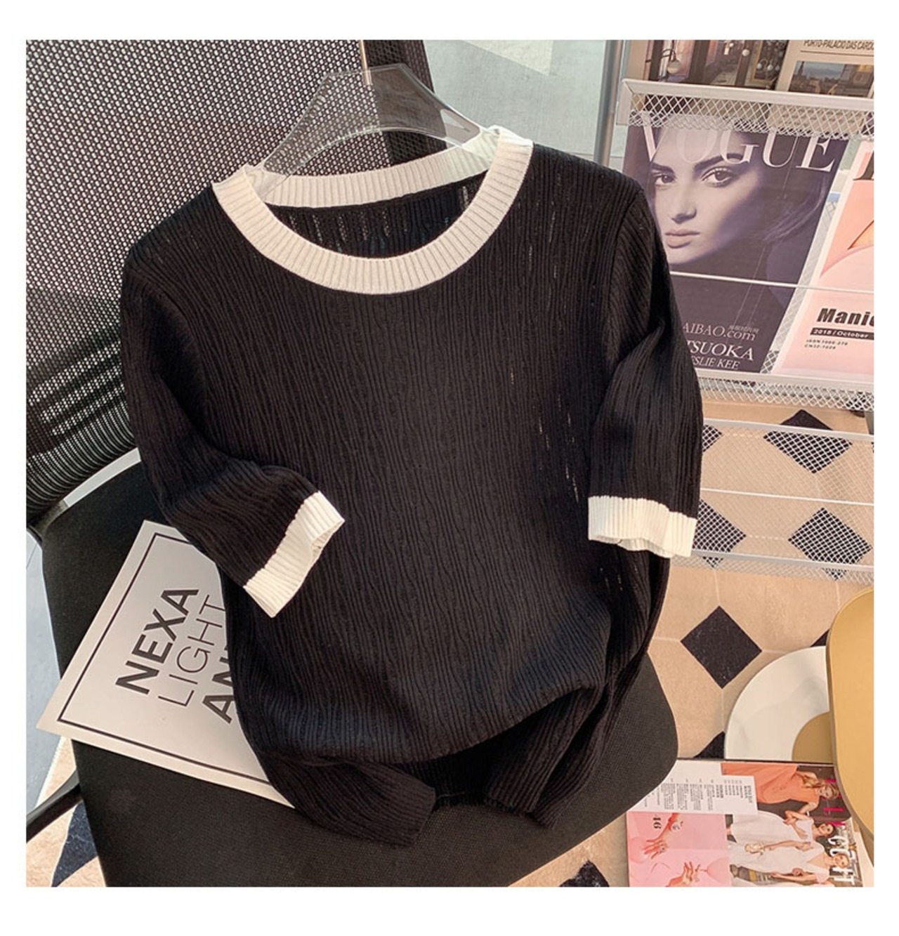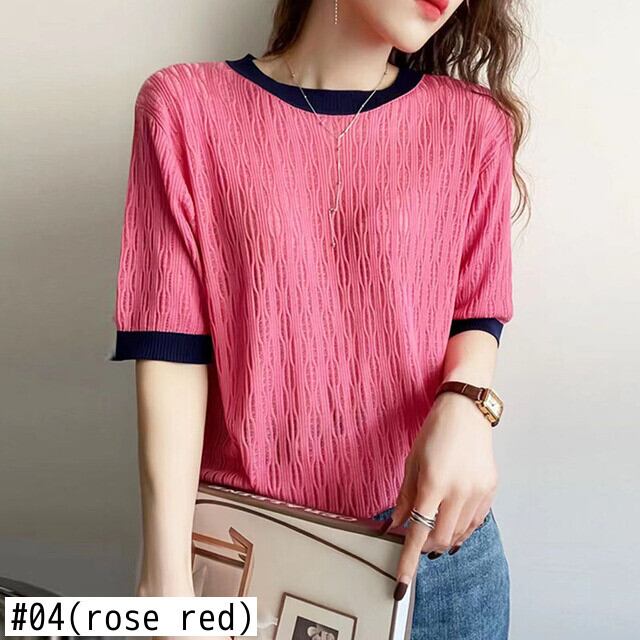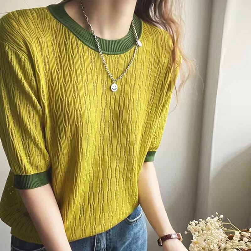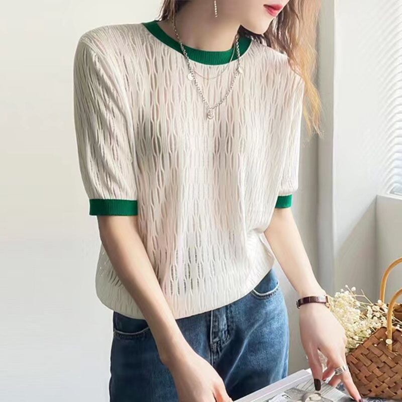 送料無料 2023 夏 O ネック半袖 Tシャツ中空アウト Tシャツ女性薄型ニットトップスパッチワーク Tシャツ ショート ハーフスリーブ サマー 夏物 Oネック AE1212887753071155979
