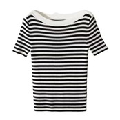送料無料 弾性スリムストライプ Tシャツ女性の夏のニットトップススラッシュネック Tシャツ半袖 Tシャツ ショート ハーフスリーブ エラスティック 伸縮 サマー 夏物 AE1212887750176309559 | 女性の為の通販サイト-fashion navi