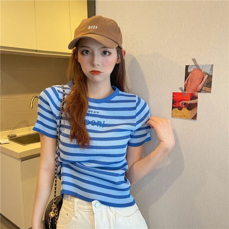 送料無料 刺繍ストライプ O ネックスリムニットトップス女性半袖服プルオーバーセータープル 2022 夏 ショート ハーフスリーブ サマー 夏物 Oネック AE1212887782313149505