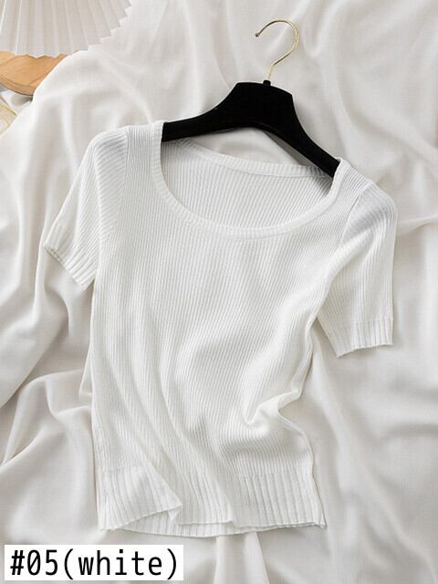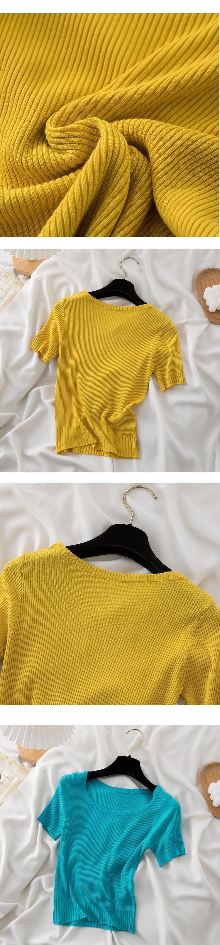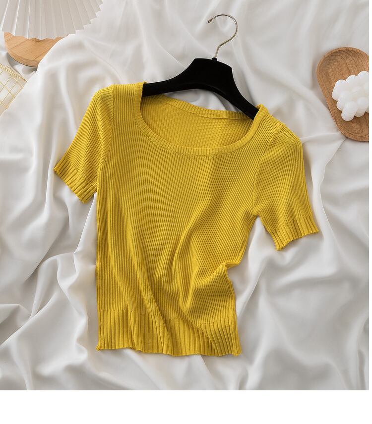 送料無料 Tシャツ 2022 夏スクエアカラー Tシャツ女性クロップトップニット女性服半袖 Tシャツ固体 Tシャツ ショート ハーフスリーブ サマー 夏物 ソリッドカラー スクウェア AE1212887717381154518