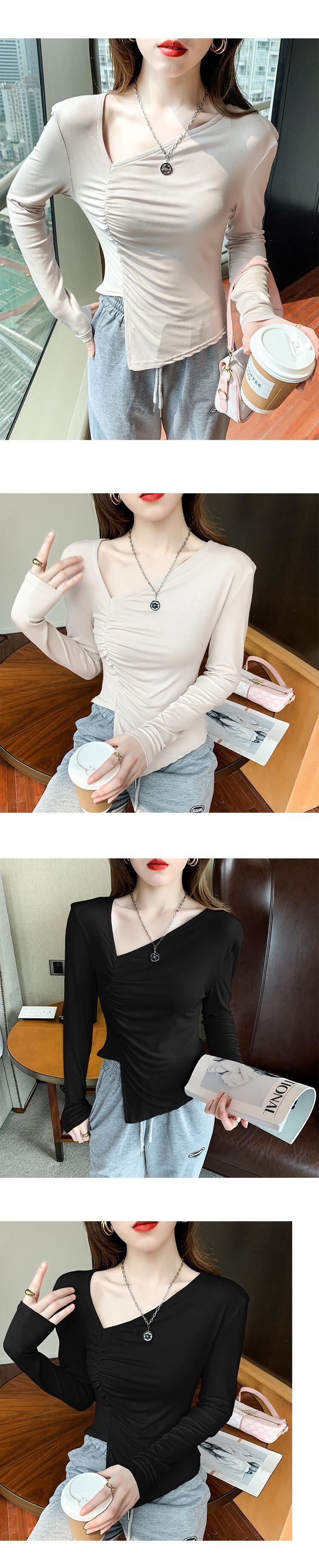 送料無料 Tシャツ 2022 スキュー襟長袖 Tシャツ女性の綿の Tシャツ折り目スリムクロップトップス春秋の女性の服 ロング コットン スプリング 春物 オータム 秋物 AE1212887724437593313