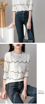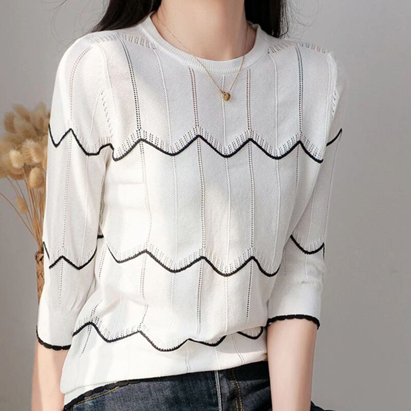 送料無料 薄い Tシャツ中空アウトアイスシルクニット Tシャツ女性 2023 夏ルーズ半袖 Tシャツストライプトップ ショート ハーフスリーブ サマー 夏物 AE1212887763592619437