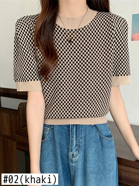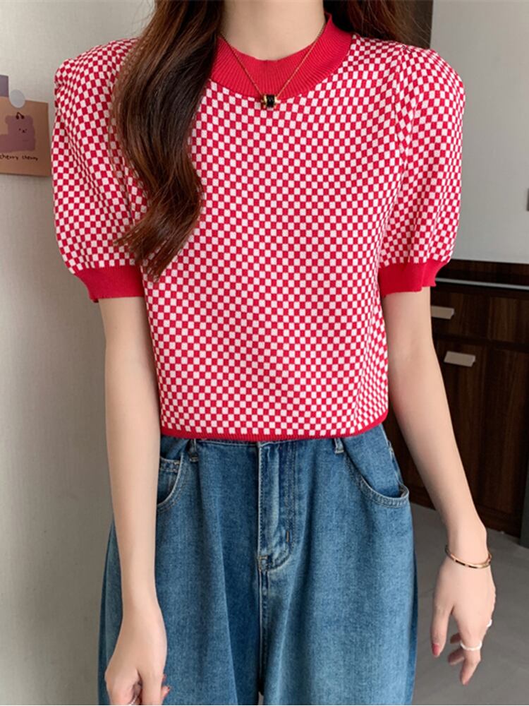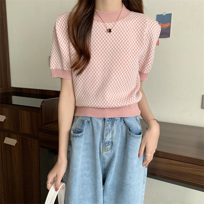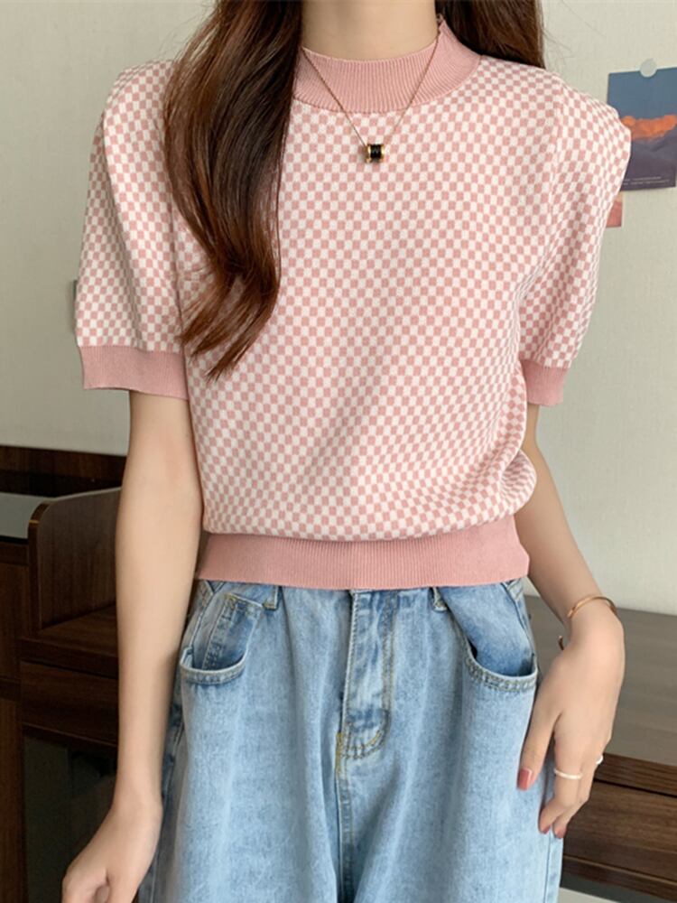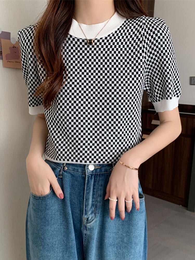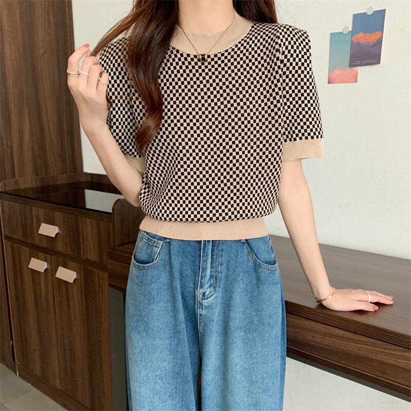 送料無料 クロップトップス女性 2022 夏半袖 Tシャツチェック柄 Tシャツ基本 Tシャツニット服 Tシャツ ショート ハーフスリーブ サマー 夏物 AE1212887731925750794