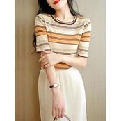 送料無料 2023 夏のアイスシルクヴィンテージニットトップス女性ストライプスリム Tシャツ女性半袖 O ネック Tシャツ Tシャツ ショート ハーフスリーブ サマー 夏物 Oネック ビンテージ AE1212887744596086651