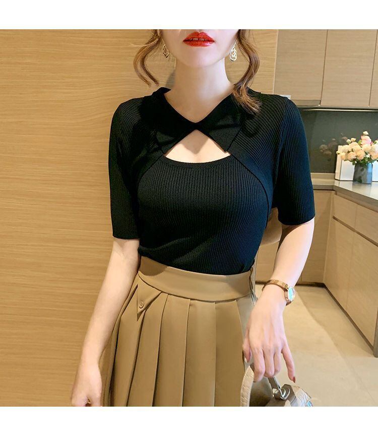 送料無料 夏白 Tシャツターンダウン襟セクシーな中空アウトニット Tシャツ女性半袖 Tシャツトップス婦人服 ショート ホワイト ハーフスリーブ サマー 夏物 AE1212887710800728695 | 女性の為の通販サイト-fashion navi