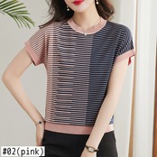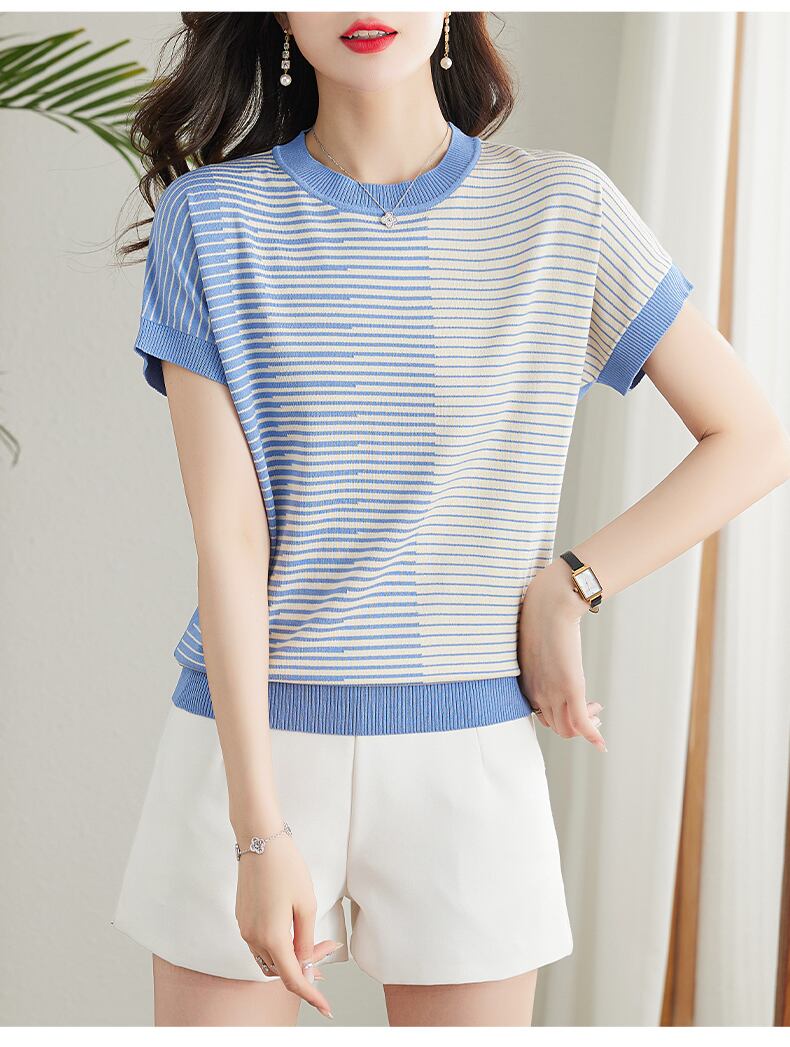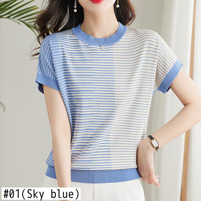 送料無料 Tシャツ夏の Tシャツ女性ニットトップス Camisetas 半袖女性 O ネック Tシャツストライプの服 ショート ハーフスリーブ サマー 夏物 Oネック AE1212887747613885696