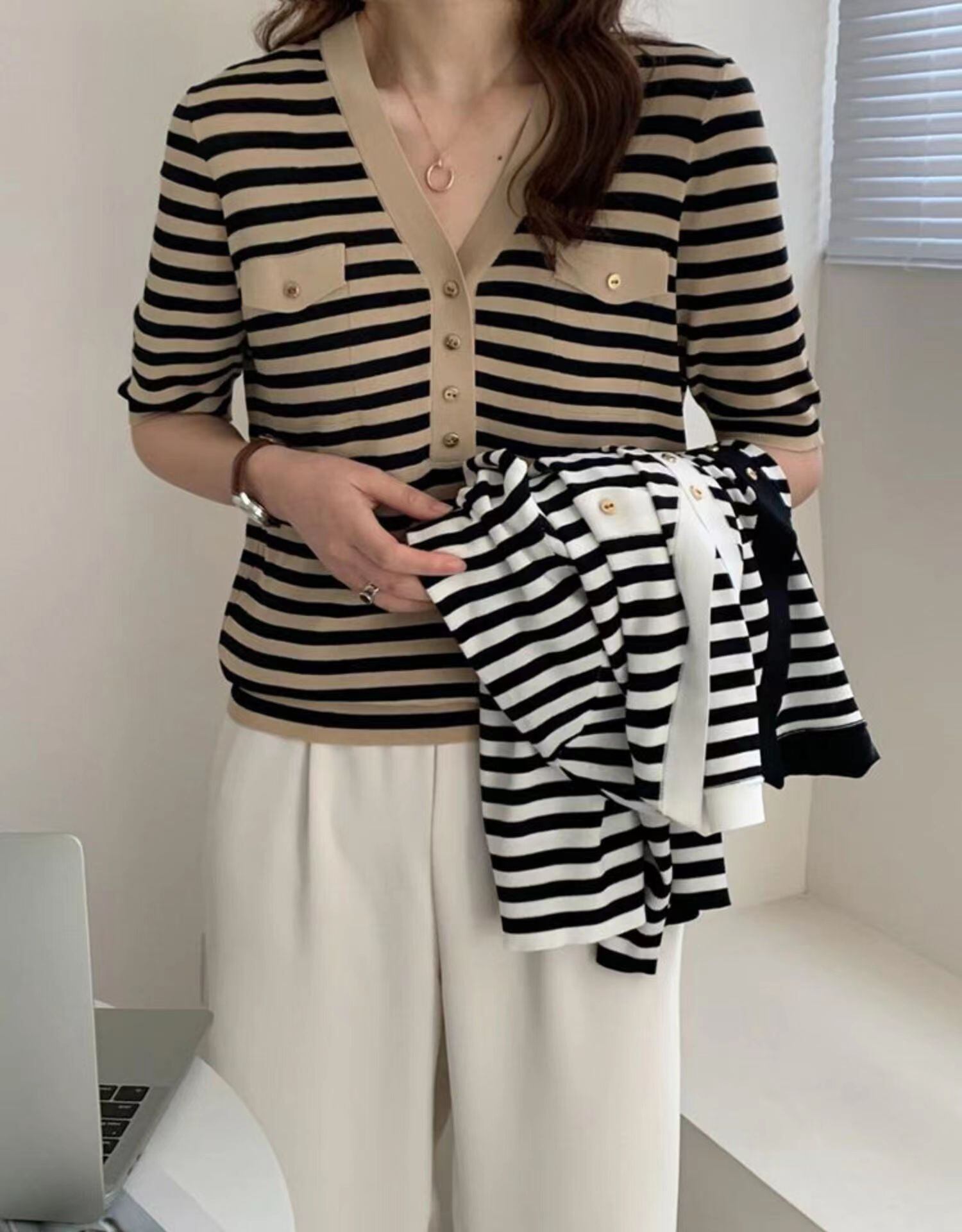 送料無料 V ネックボタンアップトップ 2022 夏のストライプ Tシャツの女性の Tシャツ女性の服ニット半袖 Tシャツ Tシャツ ショート ハーフスリーブ サマー 夏物 AE1212887710584716070