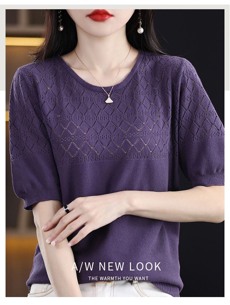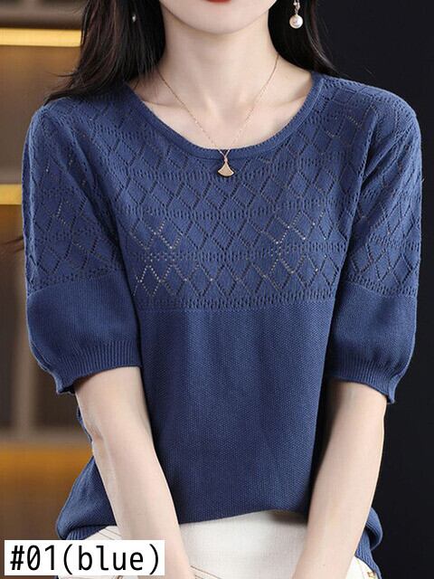送料無料 綿薄いニット Tシャツ女性 2023 夏の Tシャツ O ネック半袖中空アウト Tシャツ白ピンク薄いトップス ショート ホワイト コットン ハーフスリーブ サマー 夏物 Oネック AE1212887735648163505