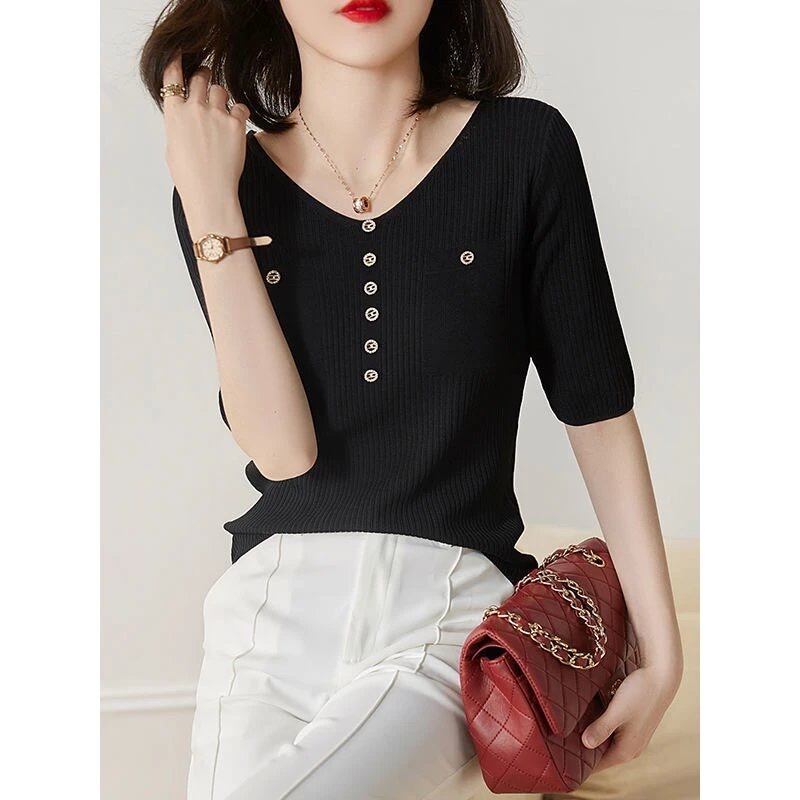 送料無料 Tシャツ夏半袖 Tシャツ女性スリム服ボタン V ネックニットトップス白 Tシャツ ショート ホワイト ハーフスリーブ サマー 夏物 Vネック AE12128877240943823 | 女性の為の通販サイト-fashion navi
