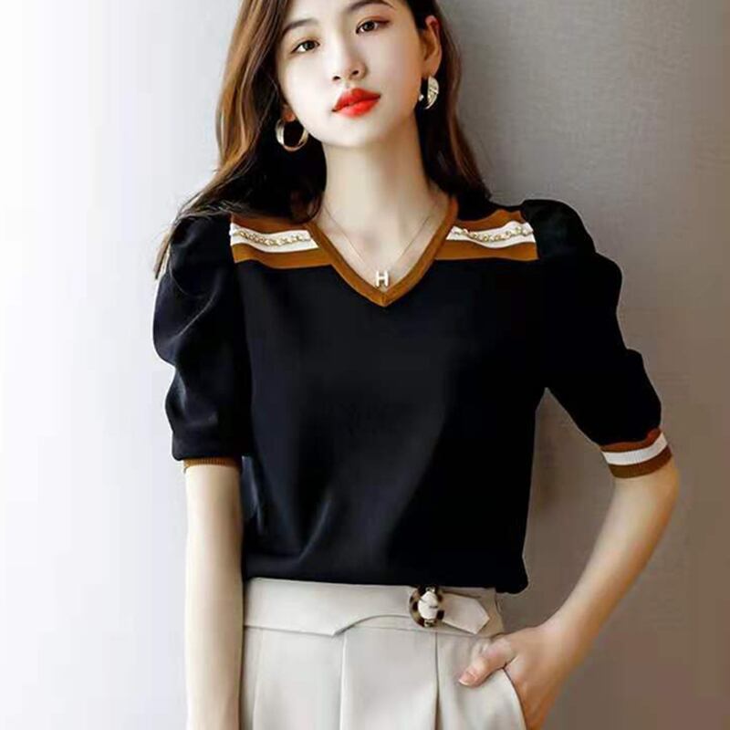 送料無料 Tシャツ夏のコントラストカラー Camisetas 薄い Tシャツ女性トップ半袖ニット Tシャツ女性の服 ショート ハーフスリーブ サマー 夏物 AE1212887771359711937