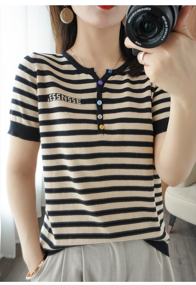 送料無料 ニット半袖 Tシャツボタンストライプ刺繍レター女性薄型 O ネック Tシャツフェミニン 2022 夏ルースアイスシルクトップス ショート ハーフスリーブ サマー 夏物 Oネック AE1212887797673543793