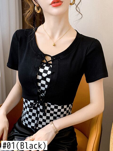 送料無料 チェック柄 Tシャツ女性偽ツーピーストップ 2022 綿 O ネック半袖 Tシャツクロップトップス夏の女性の服 ショート コットン ハーフスリーブ サマー 夏物 Oネック AE1212887790220287862