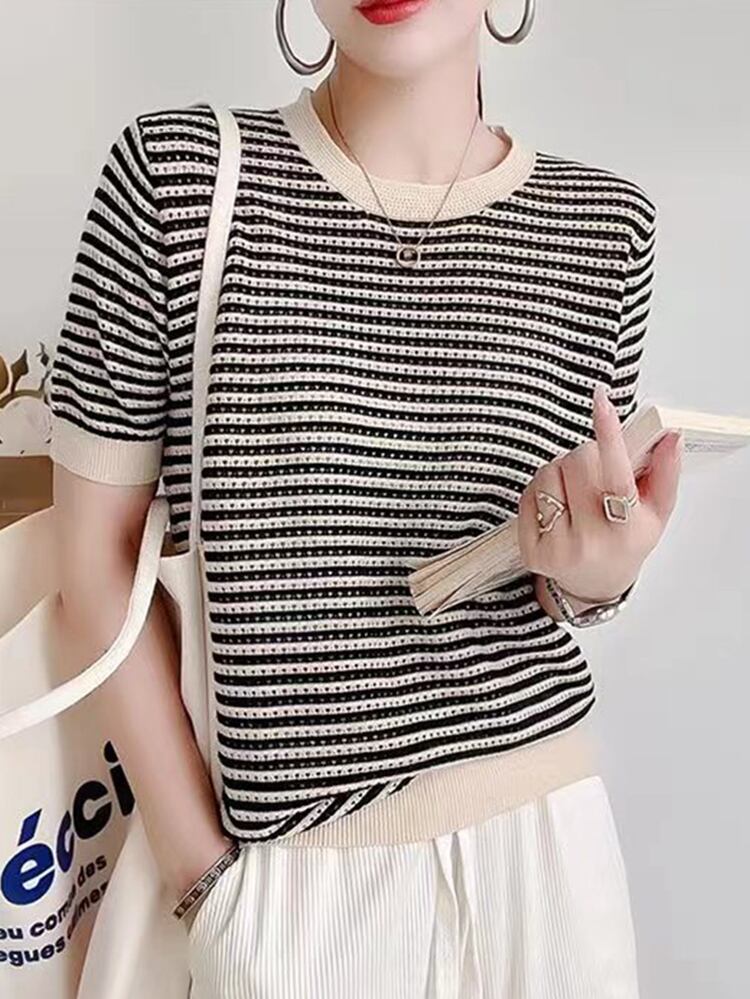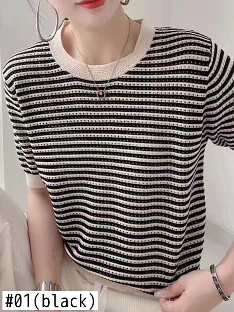 送料無料 ニット Tシャツ女性中空アウトストライプコントラストカラーラウンドネック Tシャツプルオーバールーズ薄手半袖トップス夏 ショート ハーフスリーブ サマー 夏物 Oネック AE1212887779921271926