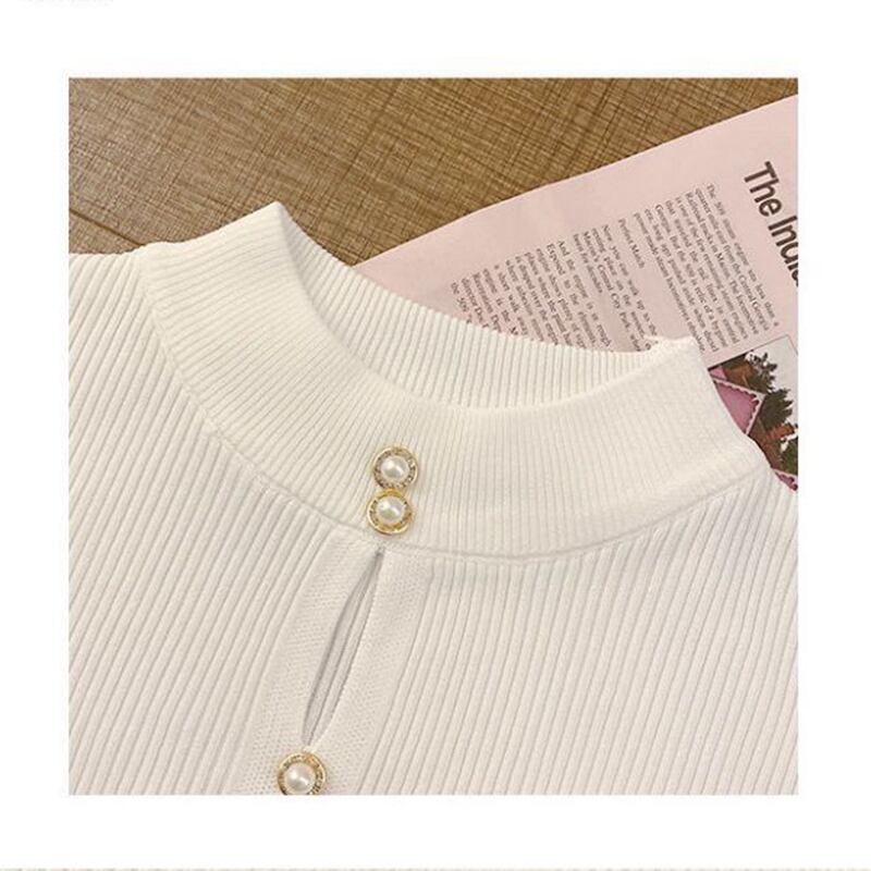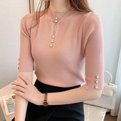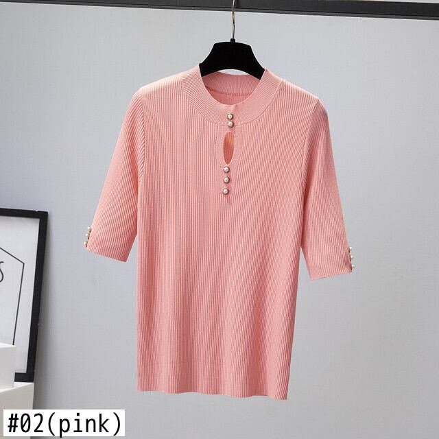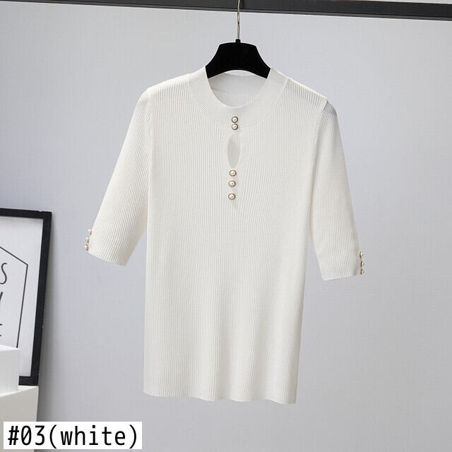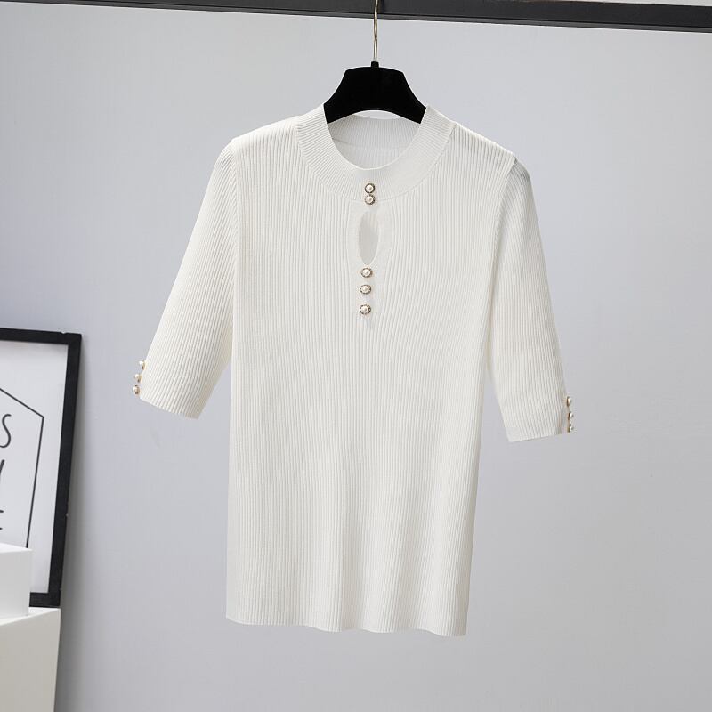 送料無料 2023 夏中空アウト Tシャツ女性薄型半袖 Tシャツニットトップスピンク O ネックボタン白スリム Tシャツ ショート ホワイト ハーフスリーブ サマー 夏物 Oネック AE1212887774167159753