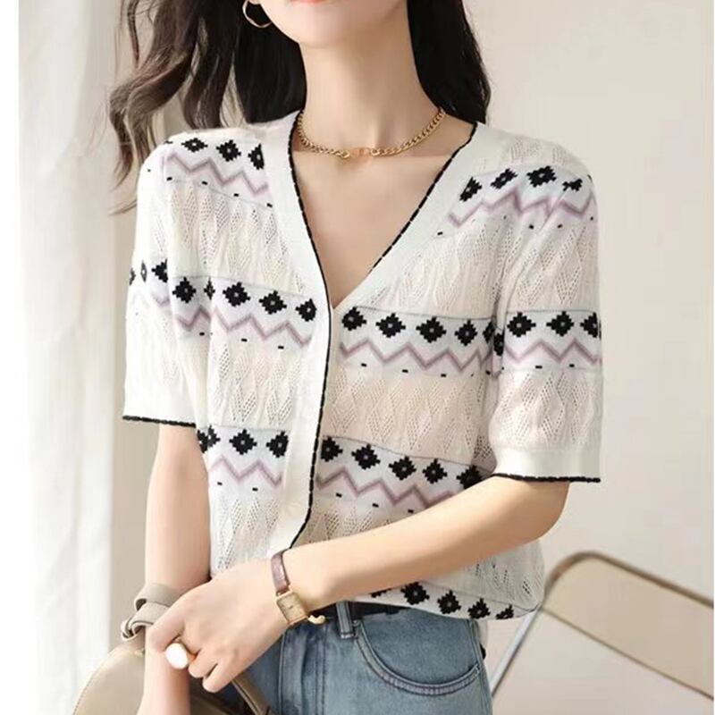 送料無料 V ネック Tシャツ 2023 夏薄型ジャカード中空アウト Tシャツ女性ニットトップカーディガン半袖 Tシャツ ショート ハーフスリーブ サマー 夏物 AE1212887780232134628 | 女性の為の通販サイト-fashion navi
