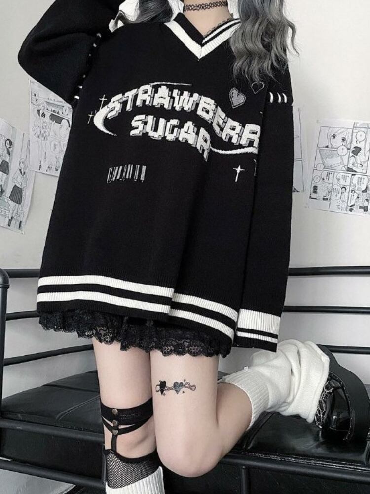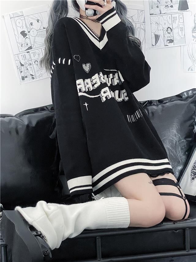 送料無料 HOUZHOU 原宿女性のセーターオーバーサイズ黒グランジ Y2k レタープリント V ネックセーターニットトップゴシックスタイルプルオーバー ブラック かわいい Vネック AE1212777668615876405