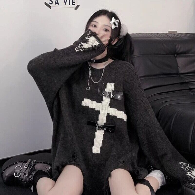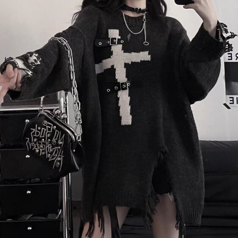 送料無料 HOUZHOU 原宿セーター女性ゴスパンク革ボタンパッチワークほつれルーズニットセーターストリートグランジプルオーバー かわいい レザー AE1212777669300402915