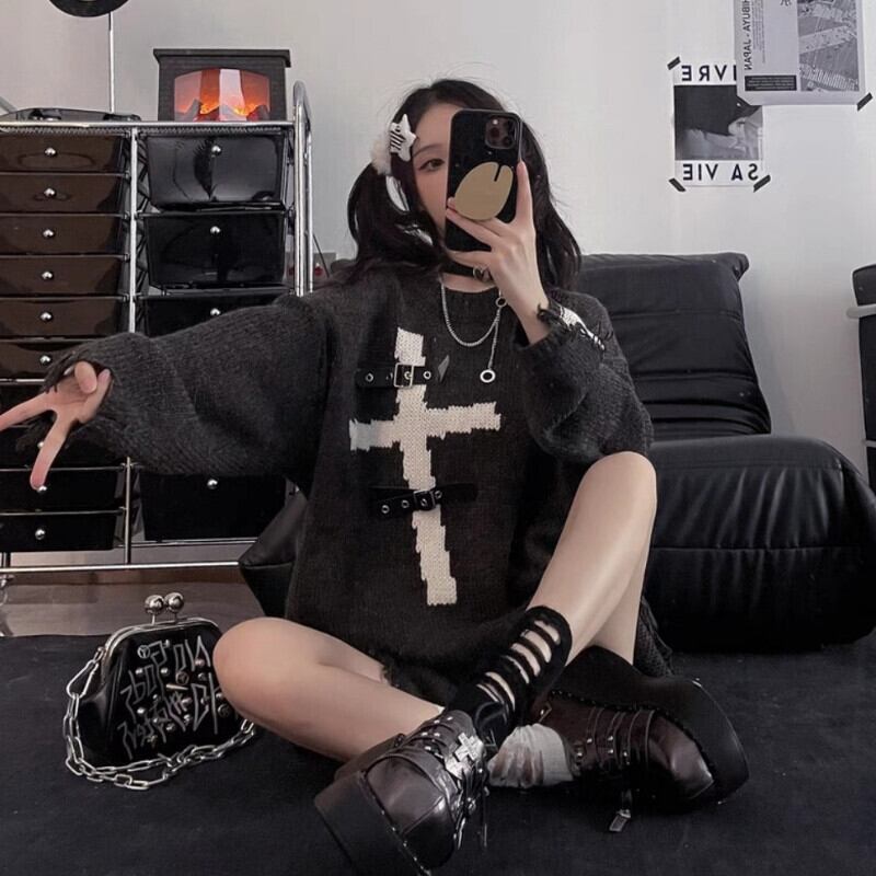 送料無料 HOUZHOU 原宿セーター女性ゴスパンク革ボタンパッチワークほつれルーズニットセーターストリートグランジプルオーバー かわいい レザー AE1212777669300402915 | 女性の為の通販サイト-fashion navi