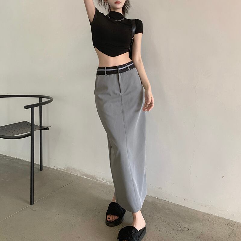 送料無料 HOUZHOU パッチワークストレートロングスカート女性ヴィンテージウエストソリッドスリムバックスリットミディスカートストリート 90 年代 ソリッドカラー ビンテージ AE12127776634929581169