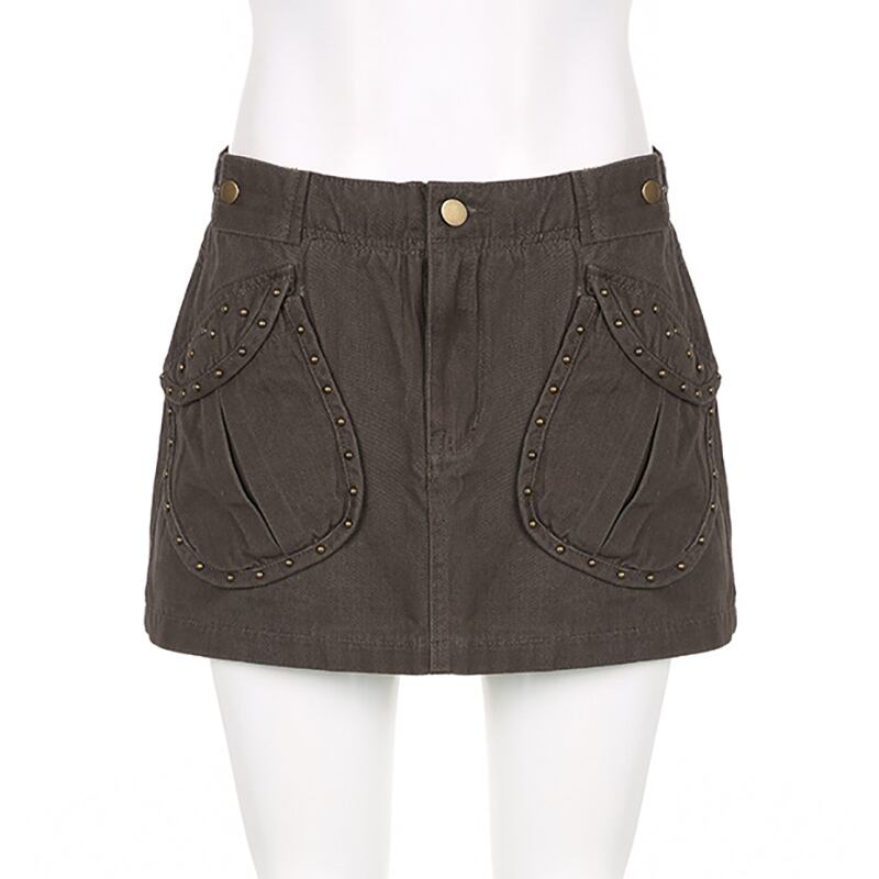 送料無料 HOUZHOU ヴィンテージ Y2k デニムミニスカートの女性ローウエストポケットリベットパッチワークジッパーユーズド加工 A ラインジーンズスカートストリート Aライン ビンテージ AE12127776647389799011