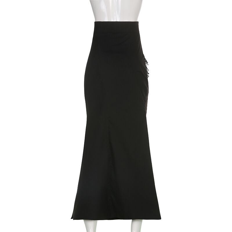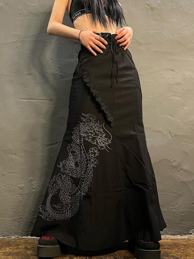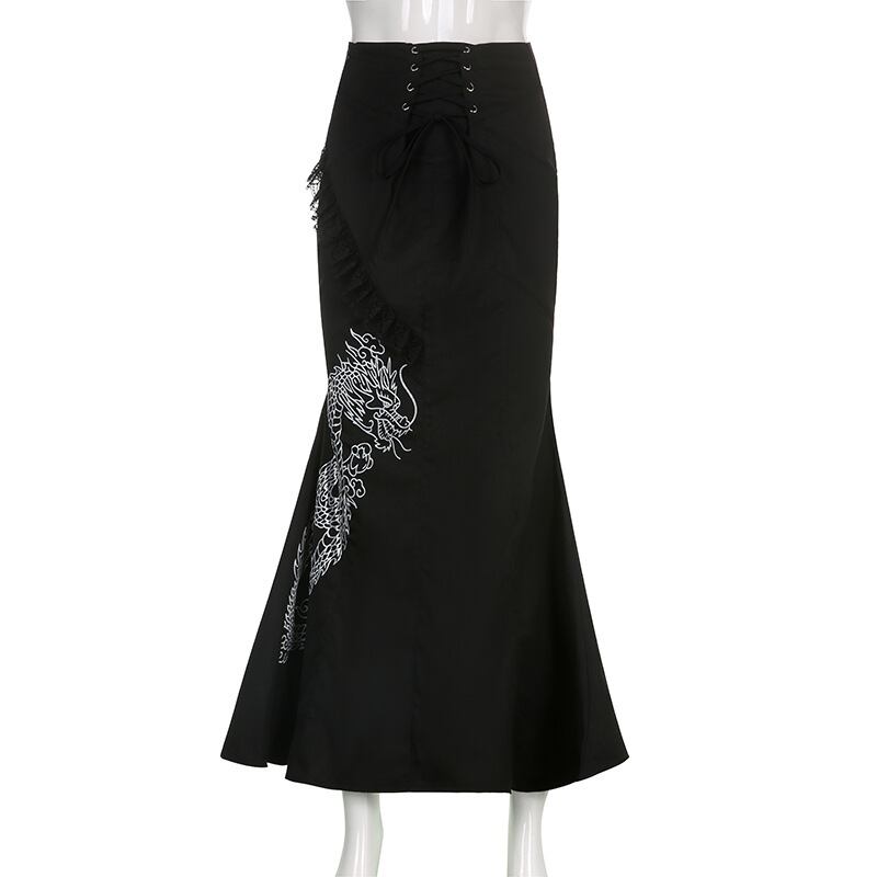 送料無料 HOUZHOU ゴシックマーメイドスカートロング女性ヴィンテージ中国ドラゴンプリントウエストレースアップスリムゴス黒マキシスカートストリート ブラック ビンテージ AE12127776694832507845