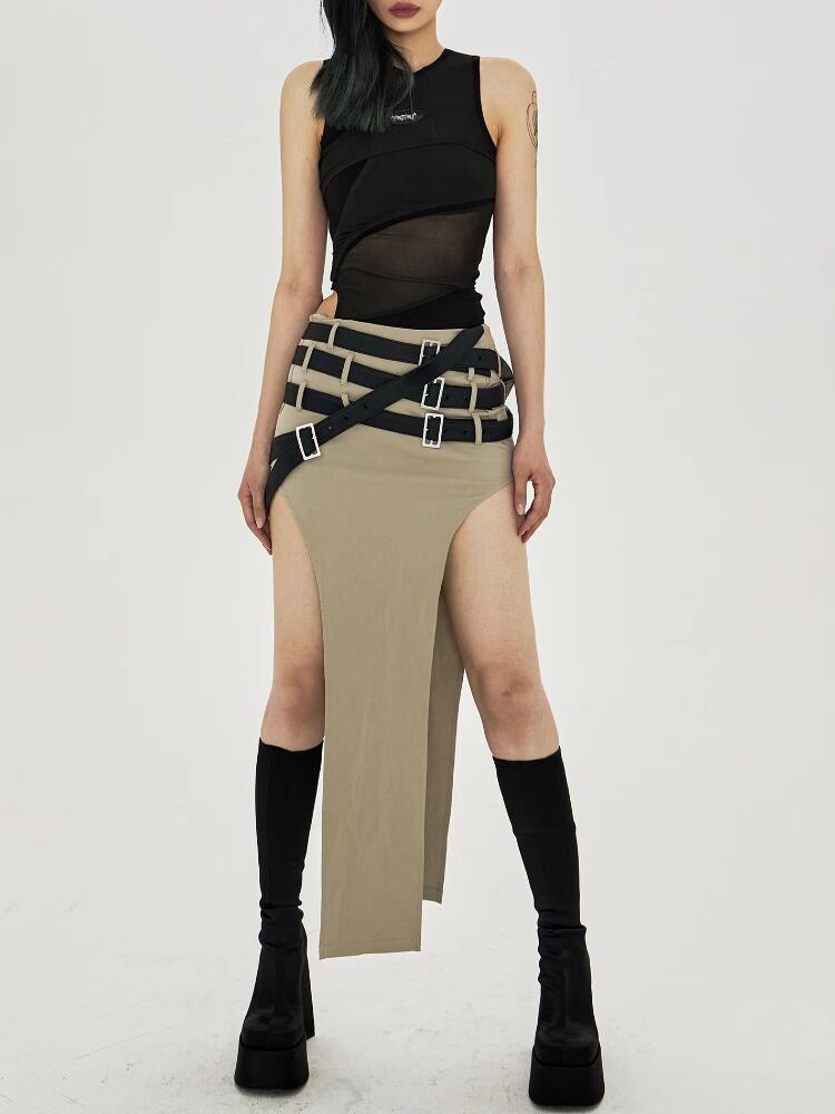 送料無料 HOUZHOU Kpop 不規則なロングスカート女性の夏のセクシーなスリムベルトパッチワークパンクウエストスプリットミディスカートスタイルストリート サマー 夏物 ハーネス AE1212777667425863920