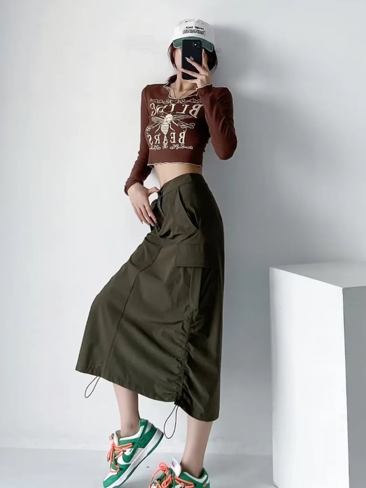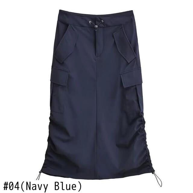 送料無料 HOUZHOU ロングカーゴスカート女性 Y2k 巾着ポケットパッチワークウエストバック分割だぶだぶのミディスカートストリート AE12127776628729078542