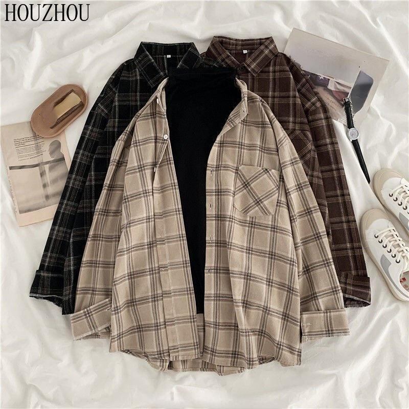 送料無料 HOUZHOU レディースチェック柄シャツスタイルオーバーサイズ長袖ボタンチェックシャツグランジターンダウンカラーヴィンテージブラウス ロング ビンテージ AE12127776642604940534 | 女性の為の通販サイト-fashion navi