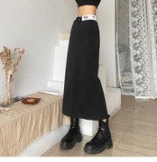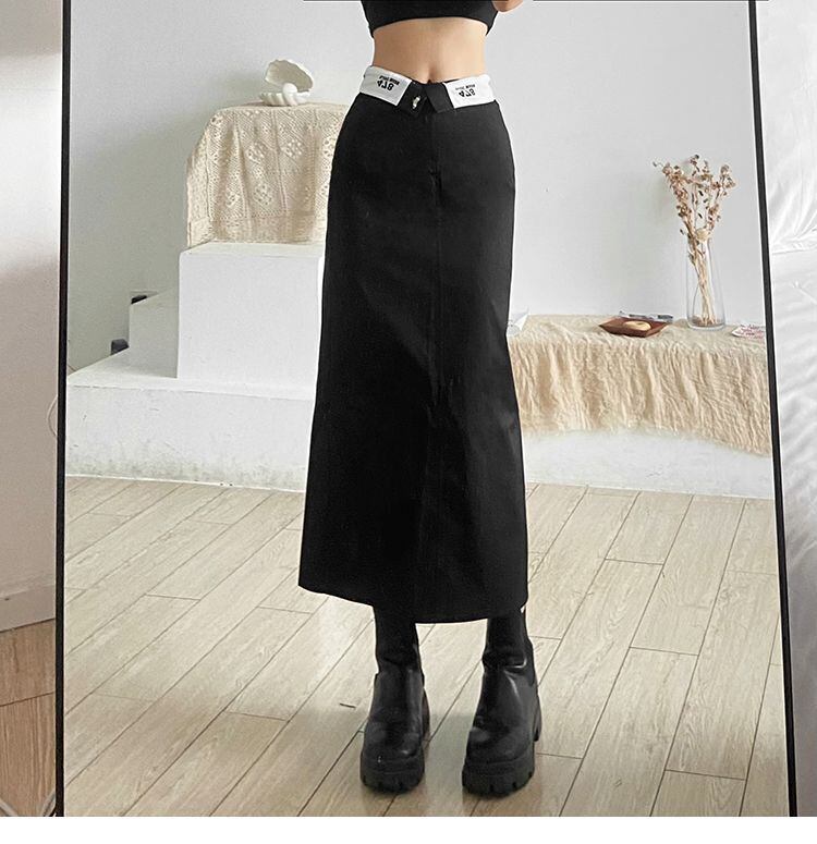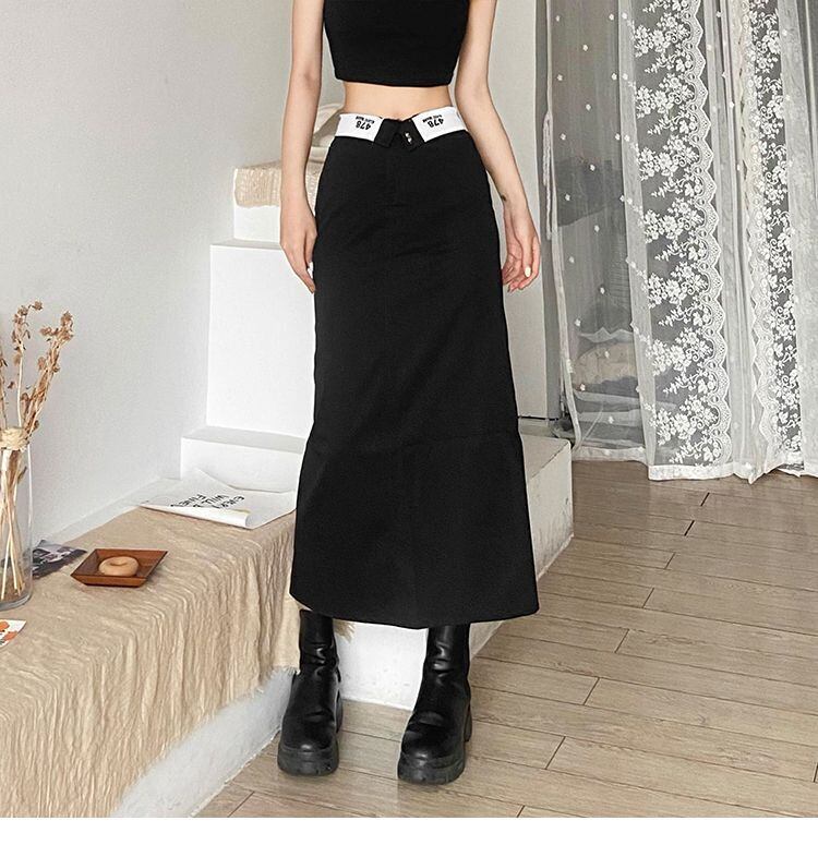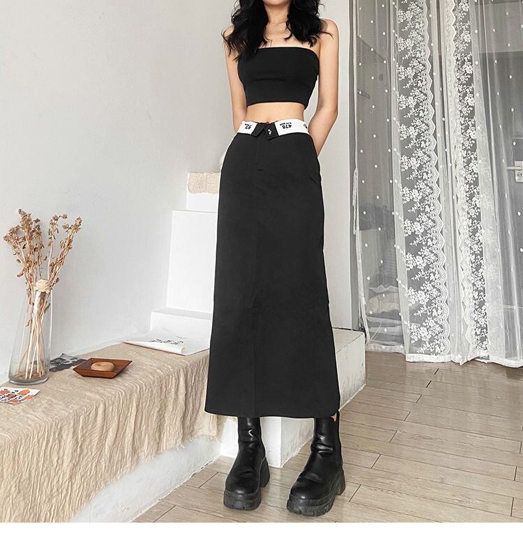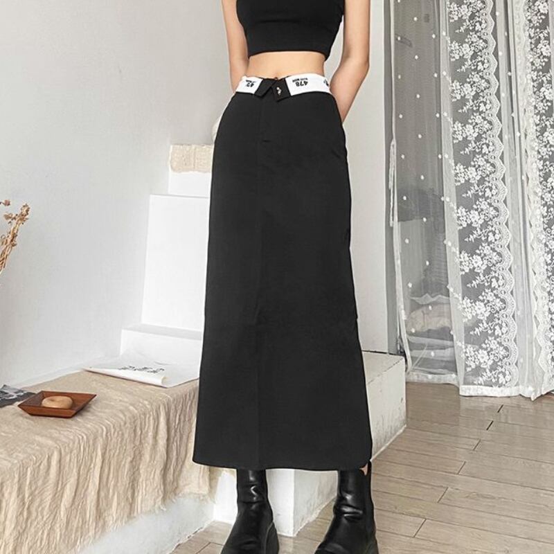 送料無料 HOUZHOU ヴィンテージ Y2k ロングブラックスカート女性ストリート 90 年代ウエストプリントパッチワークバックスプリットストレートミディスカート ビンテージ AE12127776613016869912
