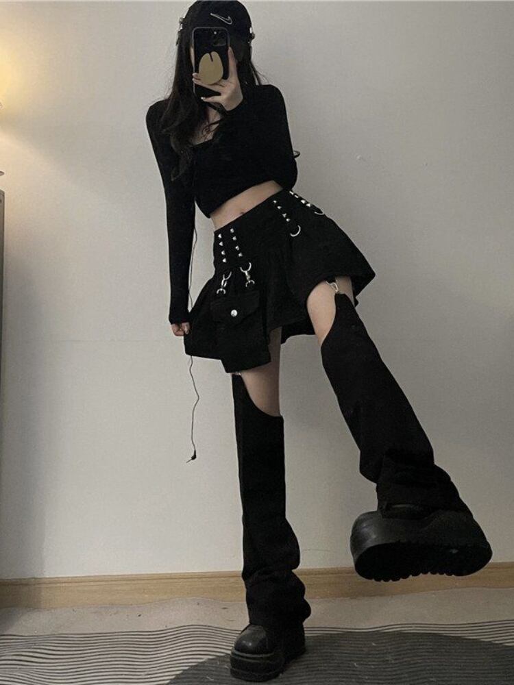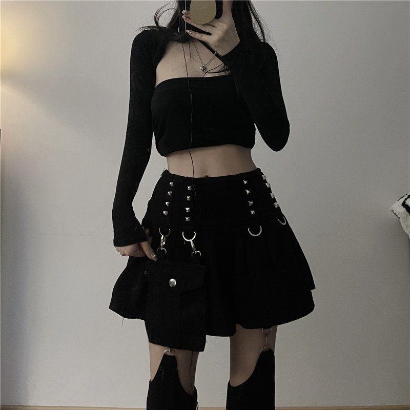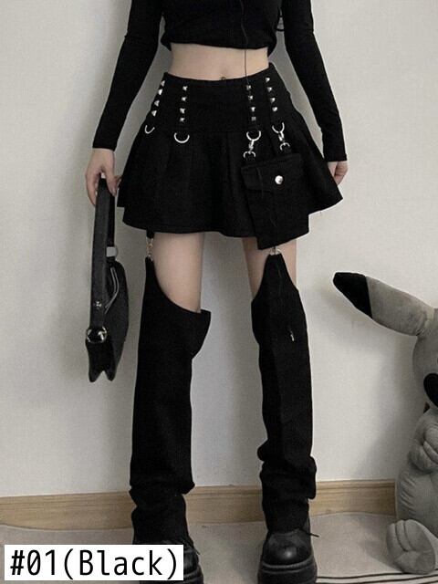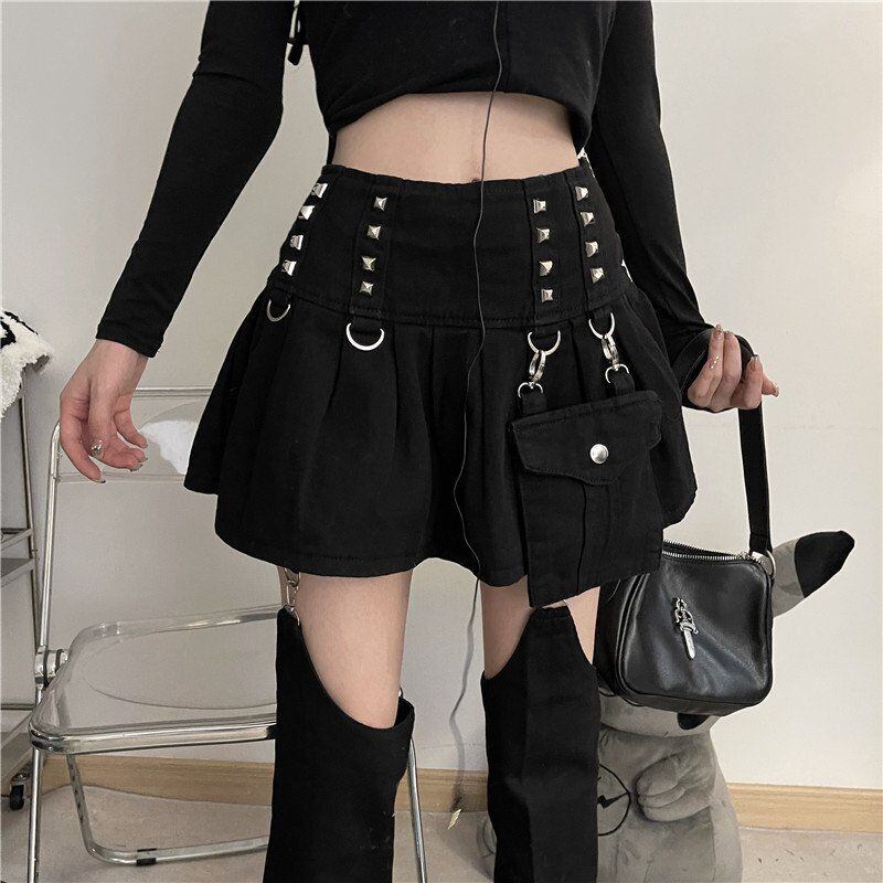 送料無料 HOUZHOU リベット Kpop プリーツミニスカート女性ゴシックストリート取り外し可能なズボン脚黒ウエストデニムスカート夏 ブラック サマー 夏物 AE12127776636879541234