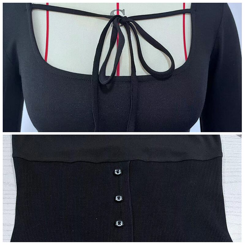 送料無料 HOUZHOU ヴィンテージ 90 年代スリム長袖トップ女性春スクエアカラーレースアップボタンパッチワーク黒ニットセクシーなトップ ロング ブラック スプリング 春物 スクウェア ビンテージ AE12127776647247217453 | 女性の為の通販サイト-fashion navi