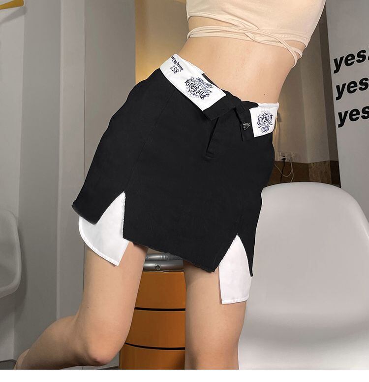 送料無料 HOUZHOU グランジ Y2k 黒ミニスカート女性シックなフランジングプリントウエスト不規則なパッチワークスプリットペンシルスカートストリート 90 年代 ブラック AE12127776679907329862