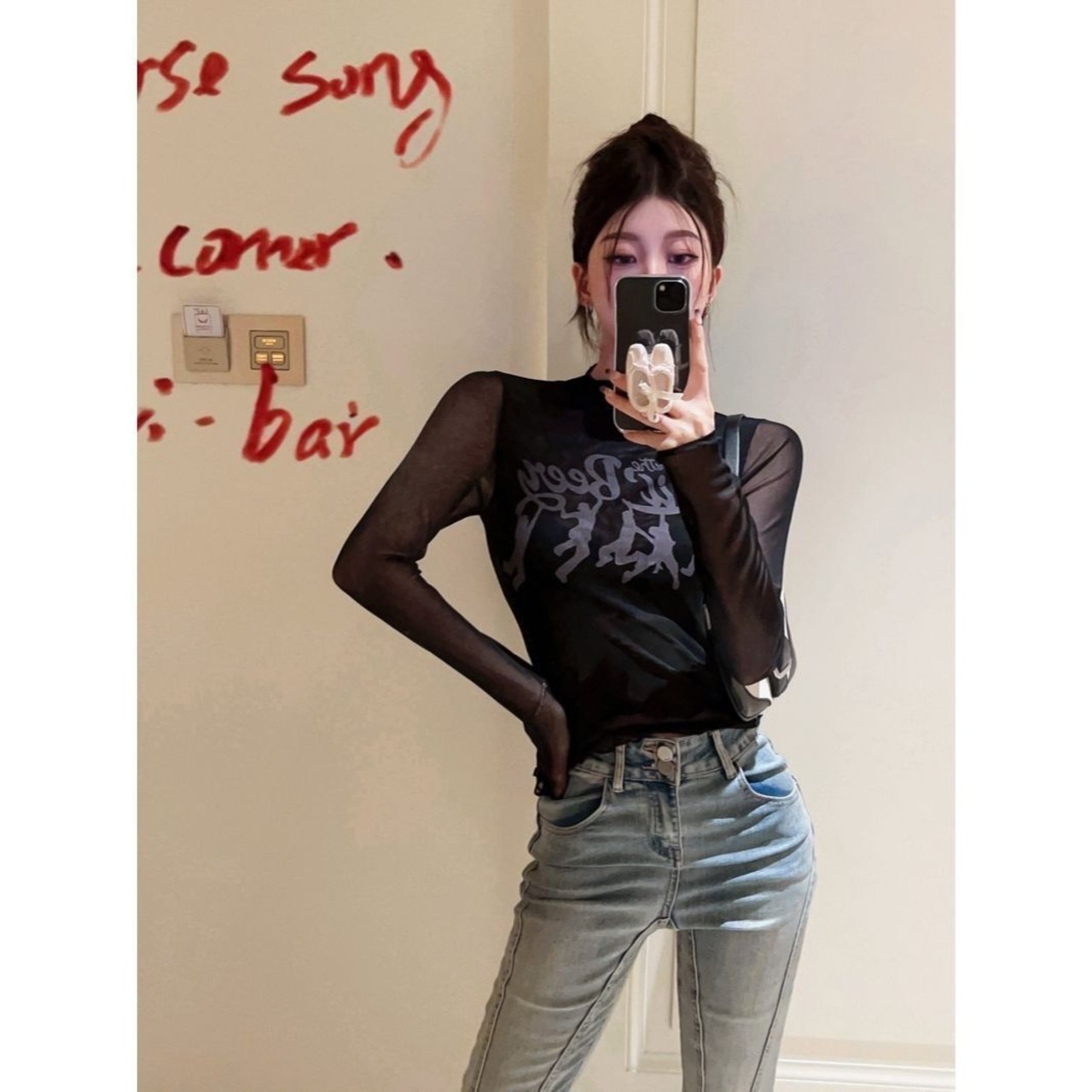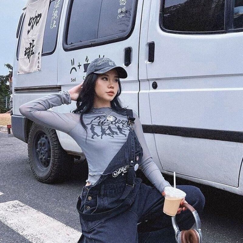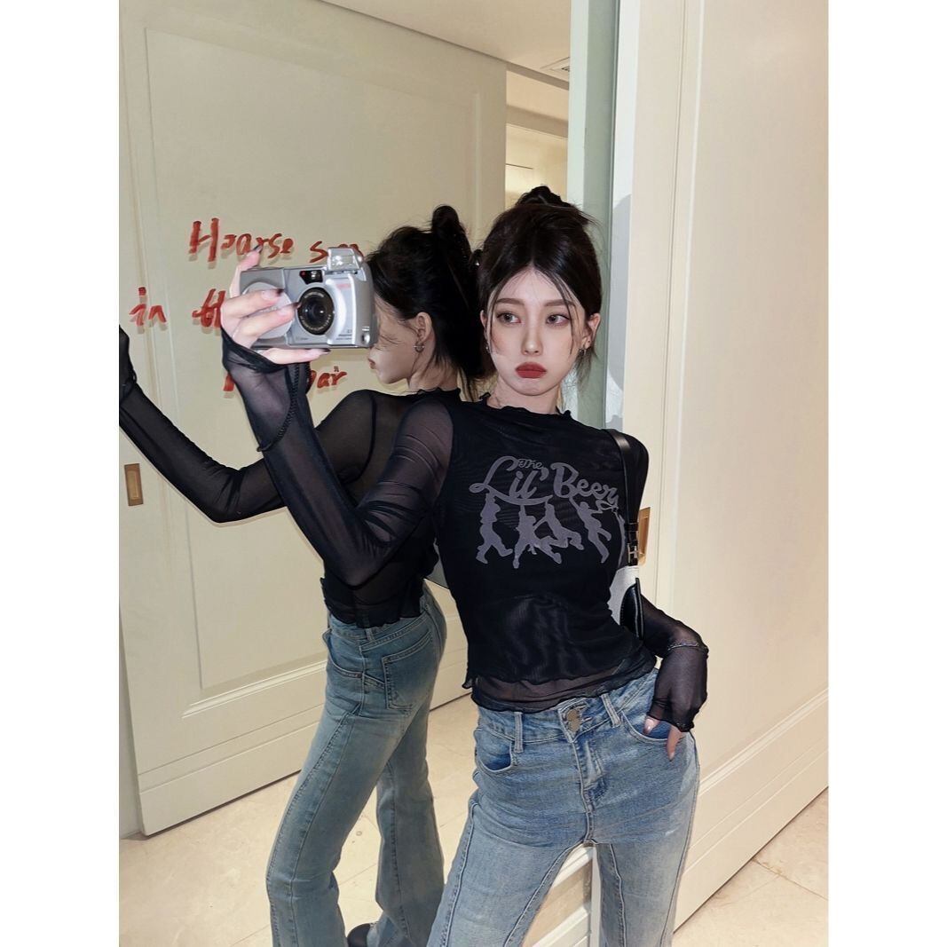 送料無料 Houzhou メッシュ Tシャツ女性グランジ Y2k プリントパッチワークスリムクロップトップヴィンテージシースルー長袖トップストリート ロング ビンテージ AE12127776673968633720