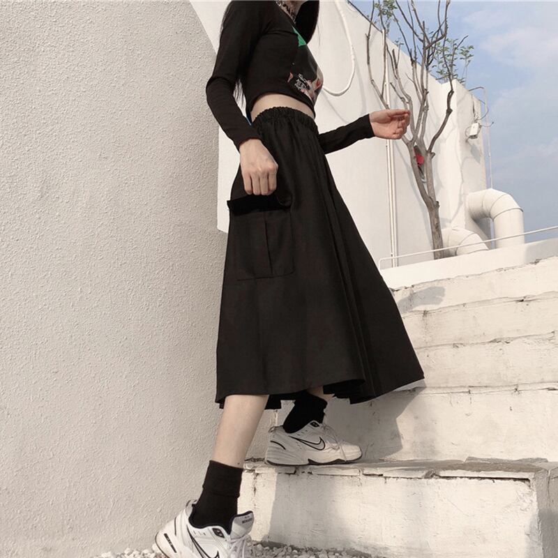 送料無料 HOUZHOU ese カーゴスカートロング女性ヴィンテージウエストポケットパッチワークルーズ固体 A ラインミディスカートストリート Aライン ソリッドカラー ビンテージ AE12127776648026149703