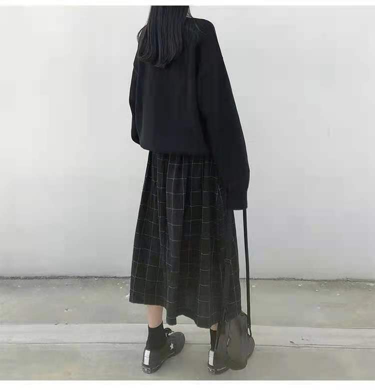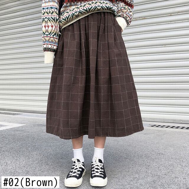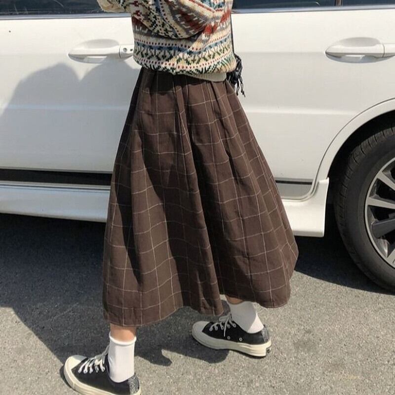 送料無料 HOUZHOU ヴィンテージロングチェック柄スカート女性ウエストルーズ A ラインミディスカート女の子秋 オータム 秋物 Aライン ビンテージ AE12127776612069488564