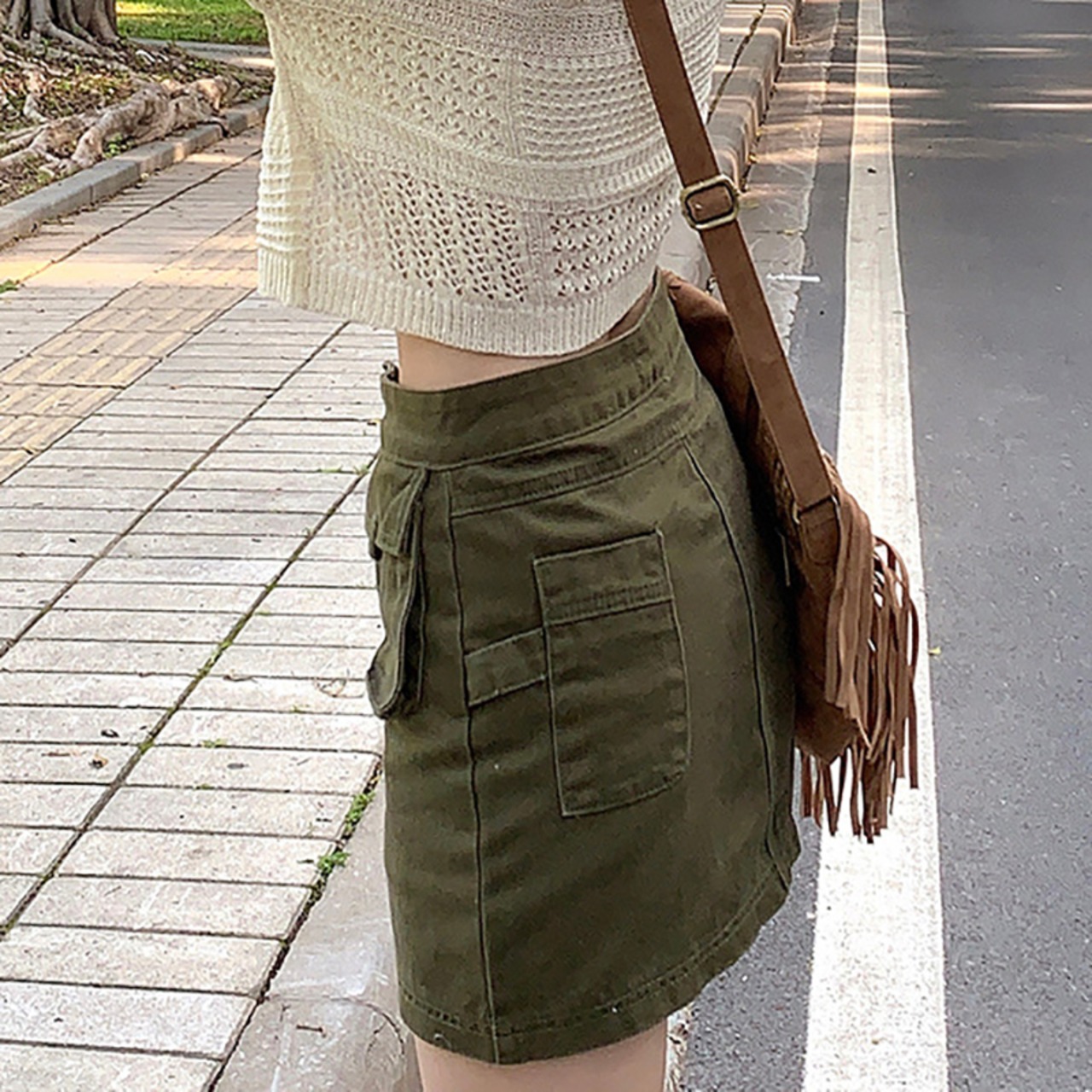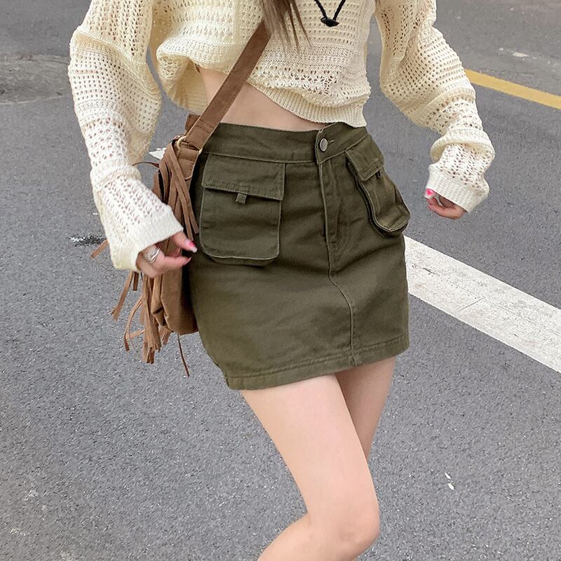 送料無料 HOUZHOU ヴィンテージ Y2k グリーンカーゴスカート女性レトロストリート 90 年代ポケットパッチワークウエスト A ラインデニムミニスカート Aライン ビンテージ AE12127776628585462170
