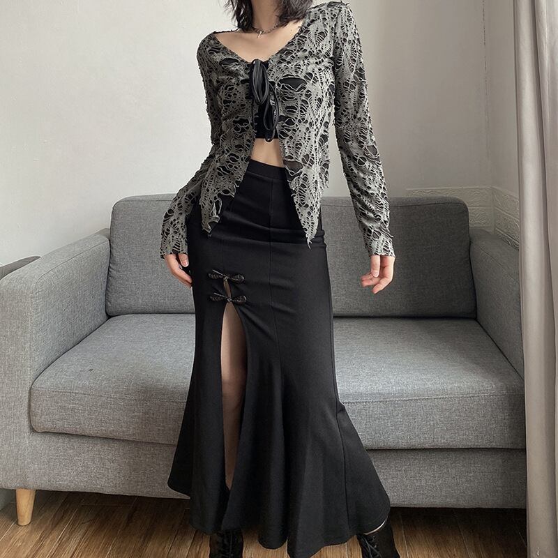 送料無料 HOUZHOU ゴシックマーメイドスカート分割女性妖精グランジスリムセクシーなウエストパッチワーク黒ミディロングスカートストリート ブラック AE12127776632791530019 | 女性の為の通販サイト-fashion navi