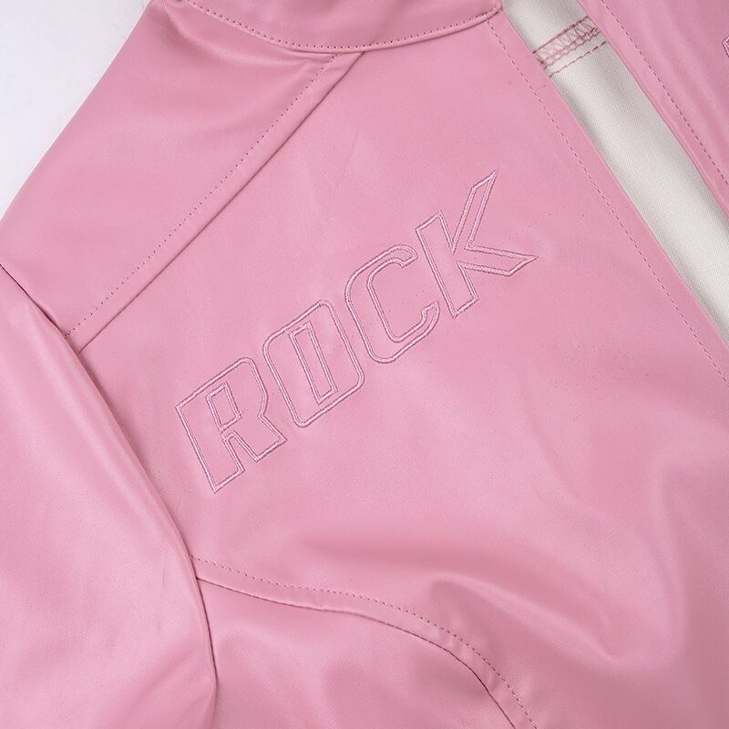 送料無料 HOUZHOU ピンク PU クロップドレザージャケット秋冬女性 Y2k 文字刺繍半襟長袖カーディガンコート ロング オータム 秋物 ウィンター 冬物 AE12127776642184952757