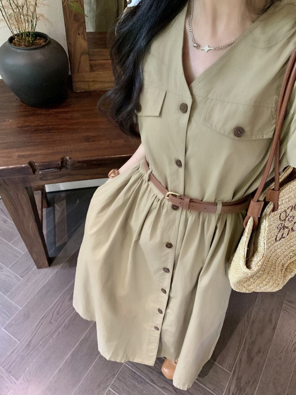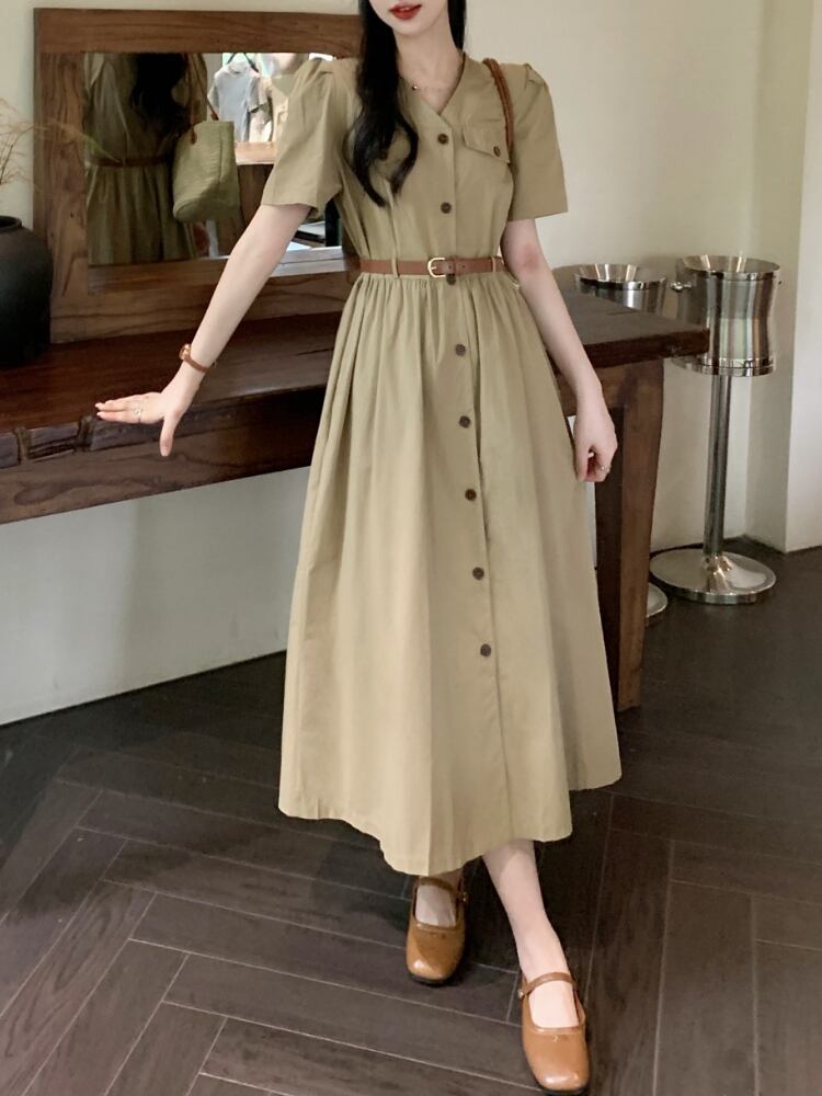 送料無料 HOUZHOU ロングサマードレスヴィンテージ女性 V ネック半袖シングルブレスト A ラインベルトシャツドレスシック ショート ハーフスリーブ 夏物 ハーネス Vネック Aライン ビンテージ AE12127776681366463184