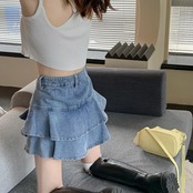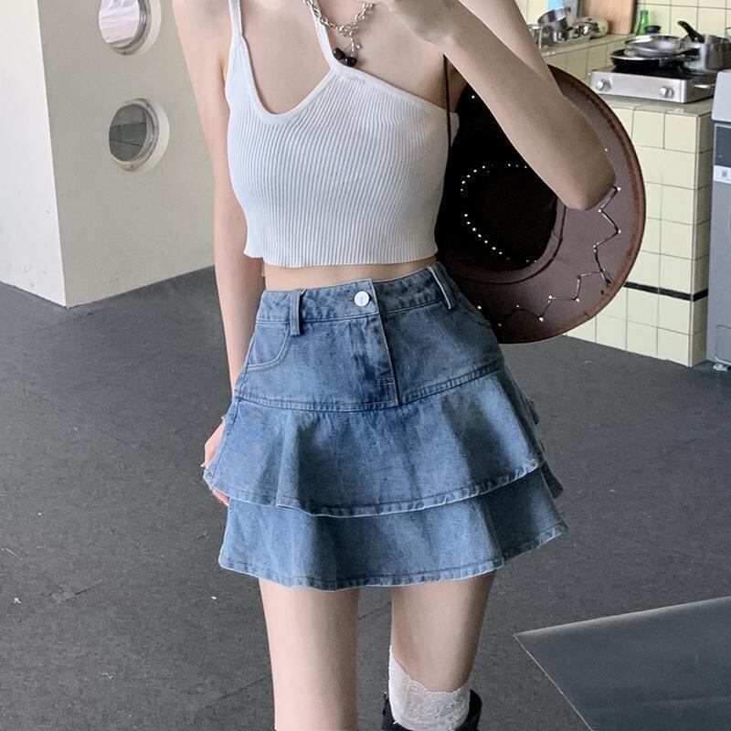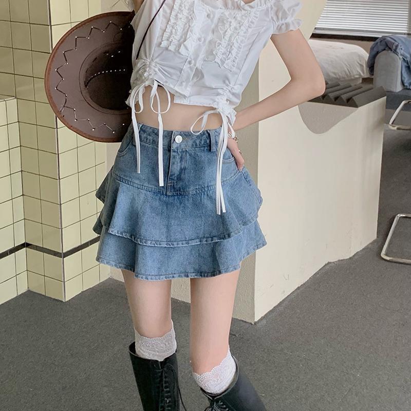 送料無料 HOUZHOU ヴィンテージデニムミニスカートフリル女性の夏のセクシーなウエストパッチワークジーンズスカートストリート サマー 夏物 ビンテージ AE12127776638677593882