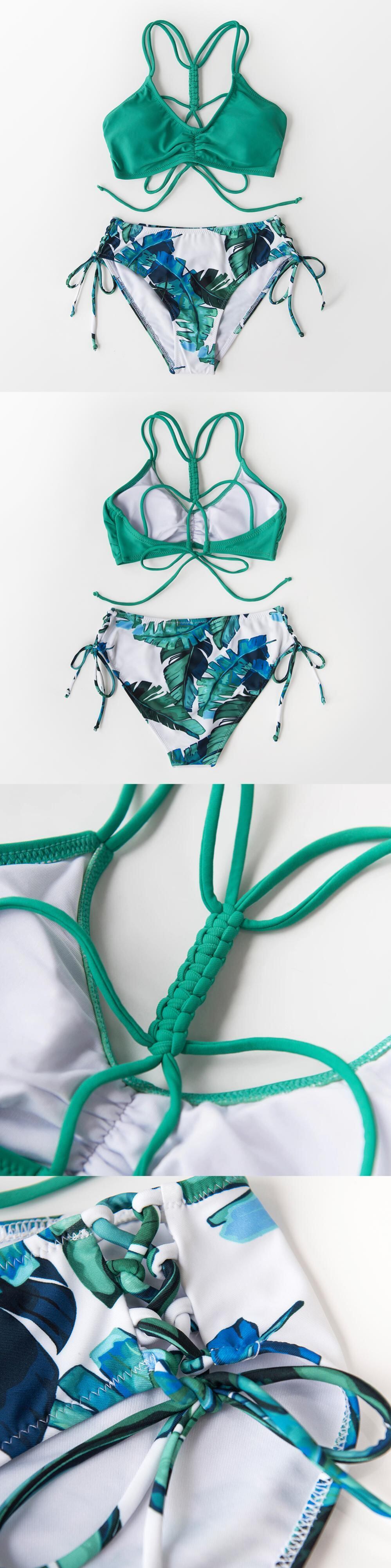 送料無料 CUPSHE グリーンと葉っぱのプリントストラップビキニセットセクシーなレースアップ水着二枚水着女性 2022 ビーチ水着 AE1212665521554414760