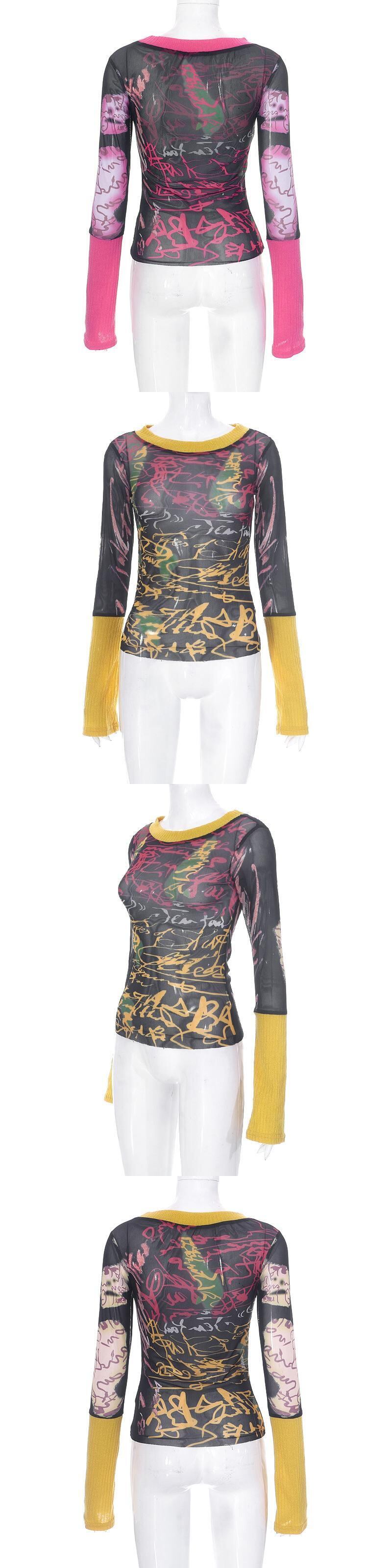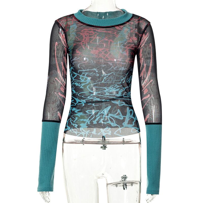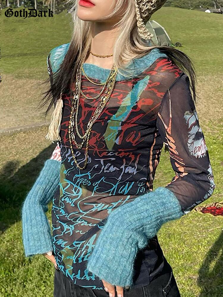 送料無料 ゴスダーク Y2k グランジレトロメッシュパッチワーク Tシャツ 90 年代美的ストリートゴシックグラフィックトップス女性パンクセクシーな Transprent Tシャツ AE155588741236840912