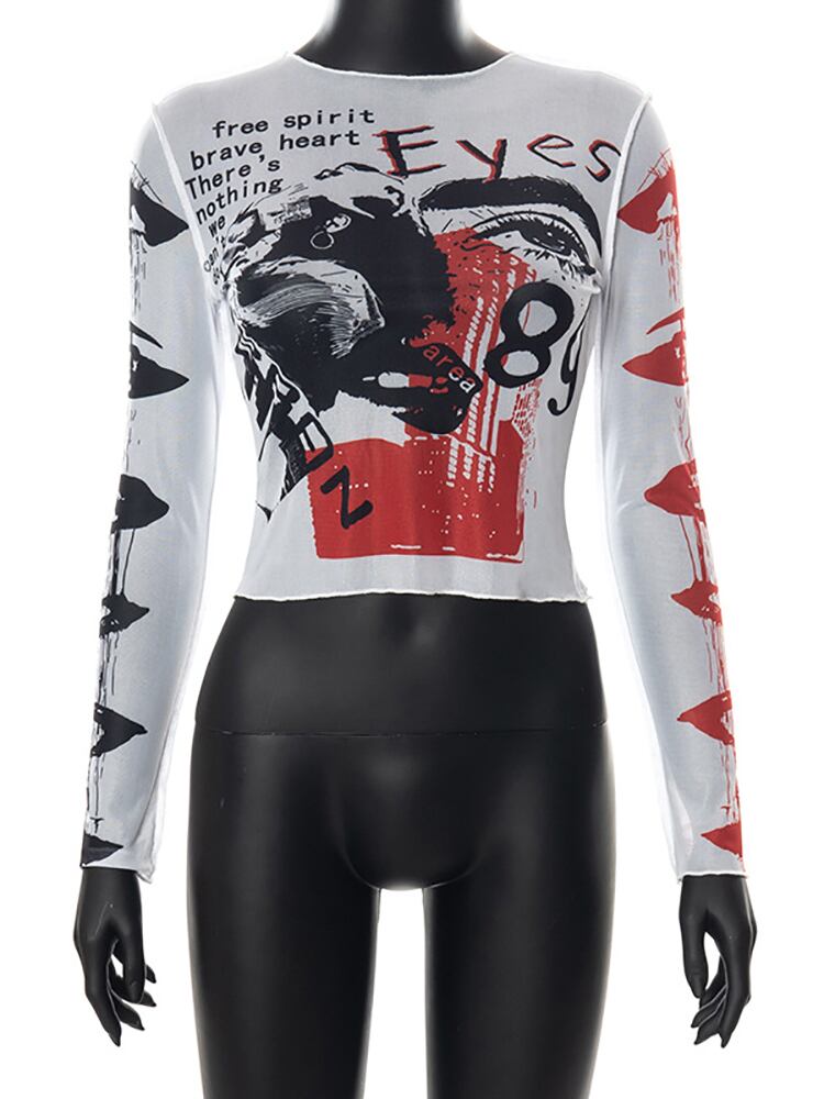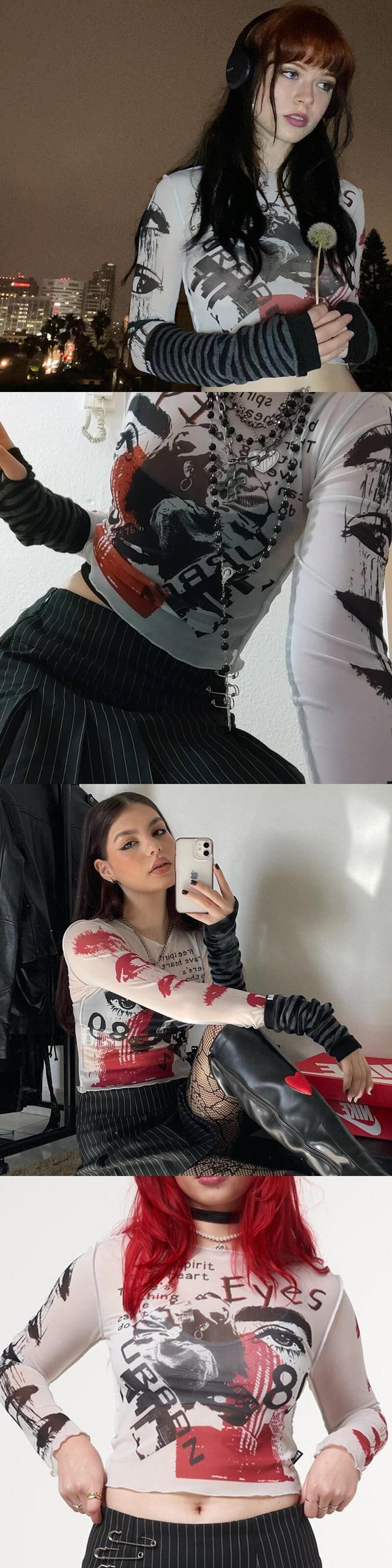 送料無料 ゴスダークメッシュゴシック美的シースルー女性 Tシャツグランジセクシーなプリントボディコンクロップトップスパンク E-長袖服 ロング AE155588778145103186