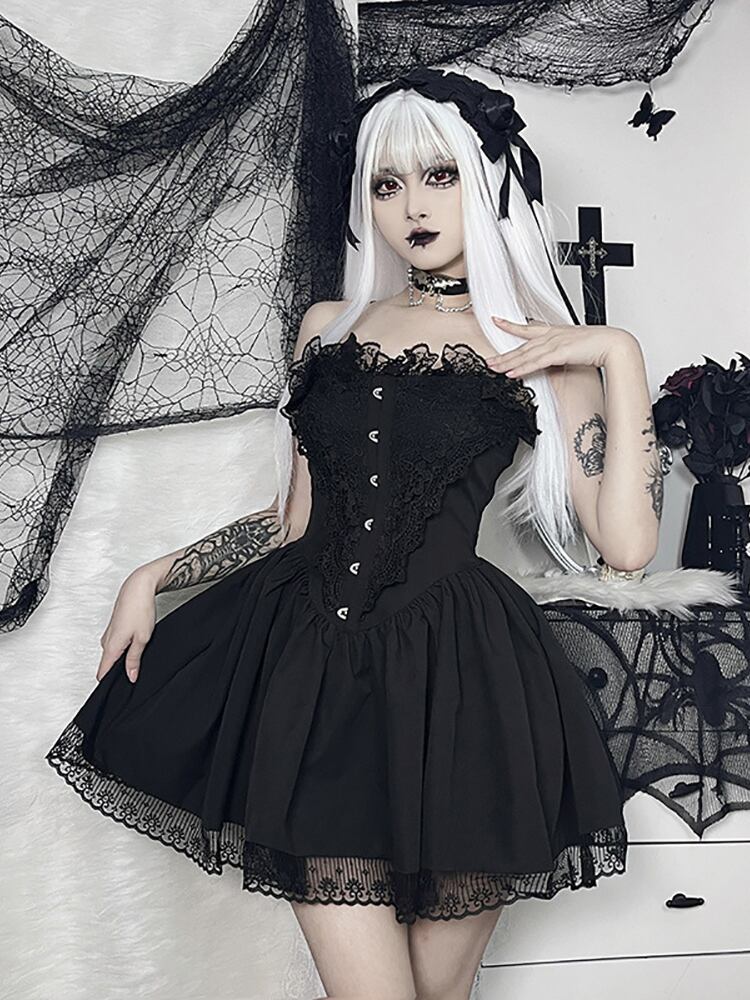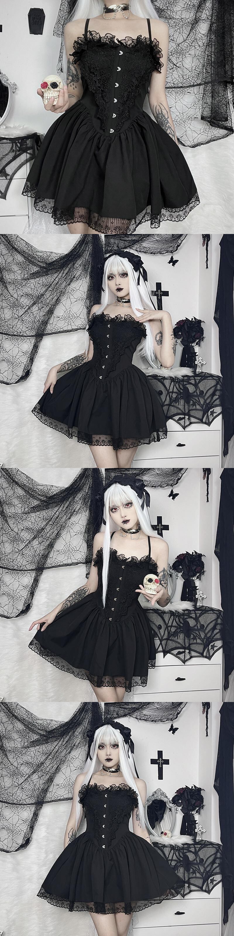 送料無料 ゴスダークロリータゴシックレーストリム A ラインコルセットドレスグランジ E スタイル美的黒ドレスパーティースリング女性オルト衣装 ブラック Aライン AE155588775491409615