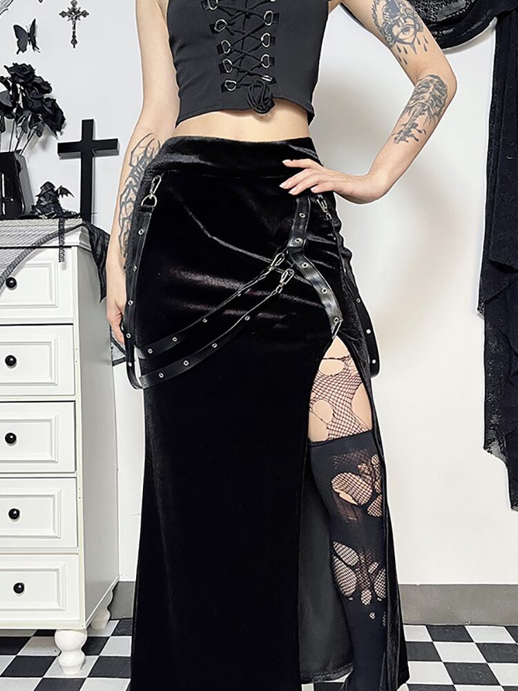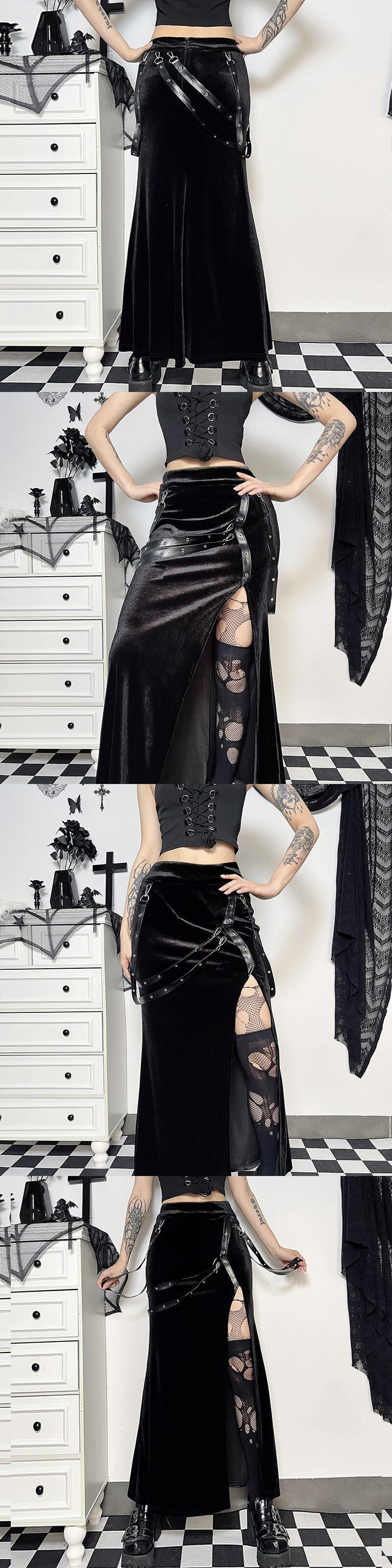 送料無料 ゴスダークベルベット Tra ゴシックヴィンテージセクシーなスプリットミディスカートグランジ美的パンク女性ロングスカートウエストストラップ Alt パーティーウェア ビンテージ AE155588778956349338