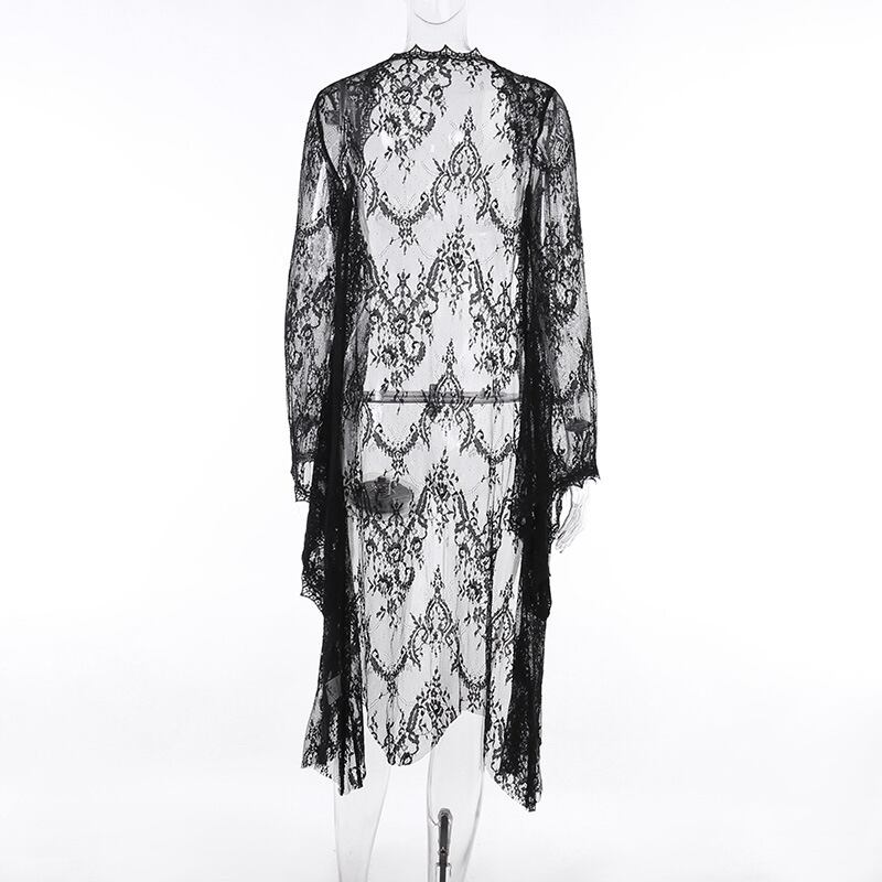 送料無料 ゴスダークレースモールゴシック薄手のロングカーディガンセクシーなフレアスリーブグランジ美的ローブ女性メッシュシースルー服 AE155588758906471192
